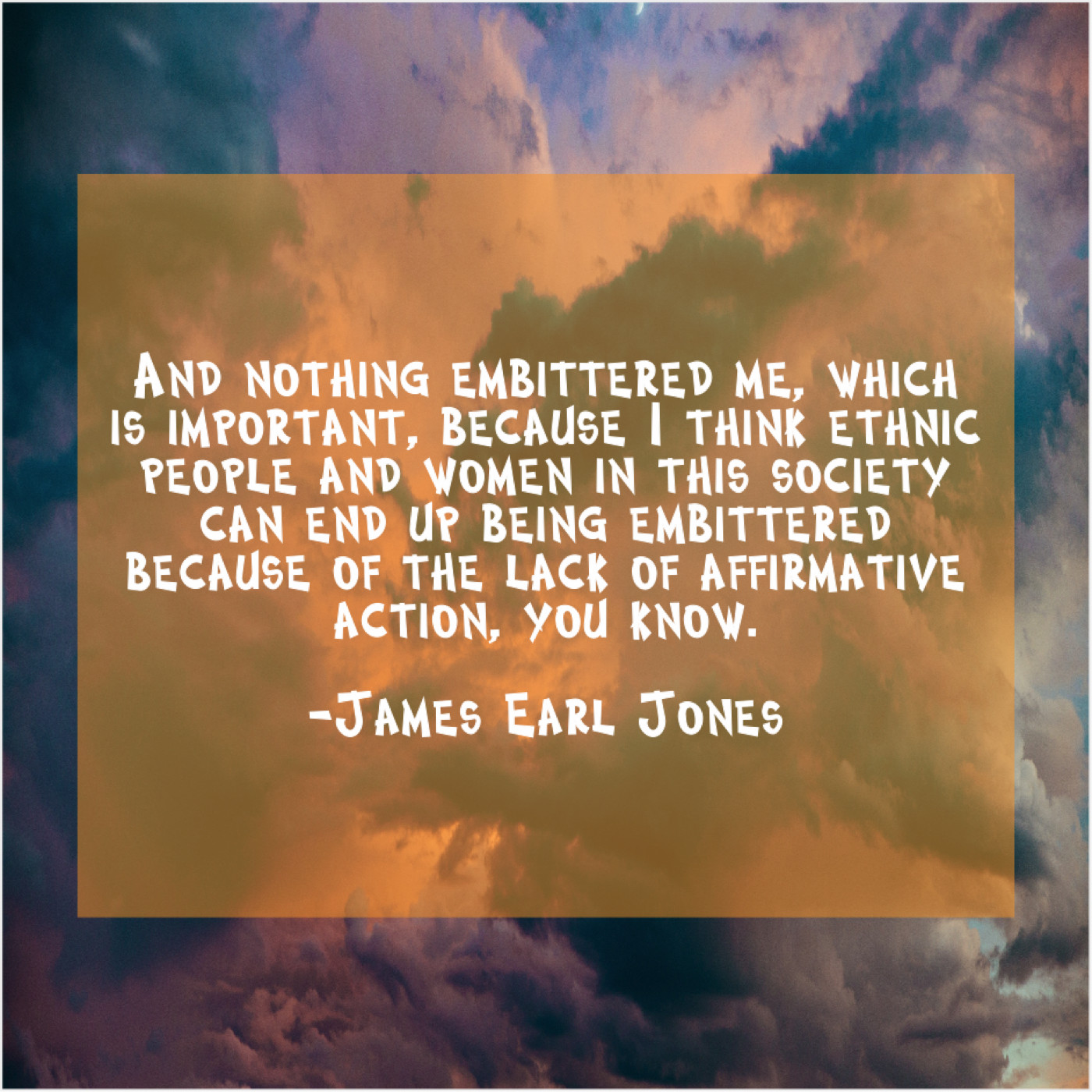 James Earl Jones James Earl Jones – And nothing embittered me, which… July 23, 2019 admin “And nothing embittered me, which is important, because I think ethnic people and women in this society can end up being embittered because of the lack of affirmative action, you know.”-James Earl Jones