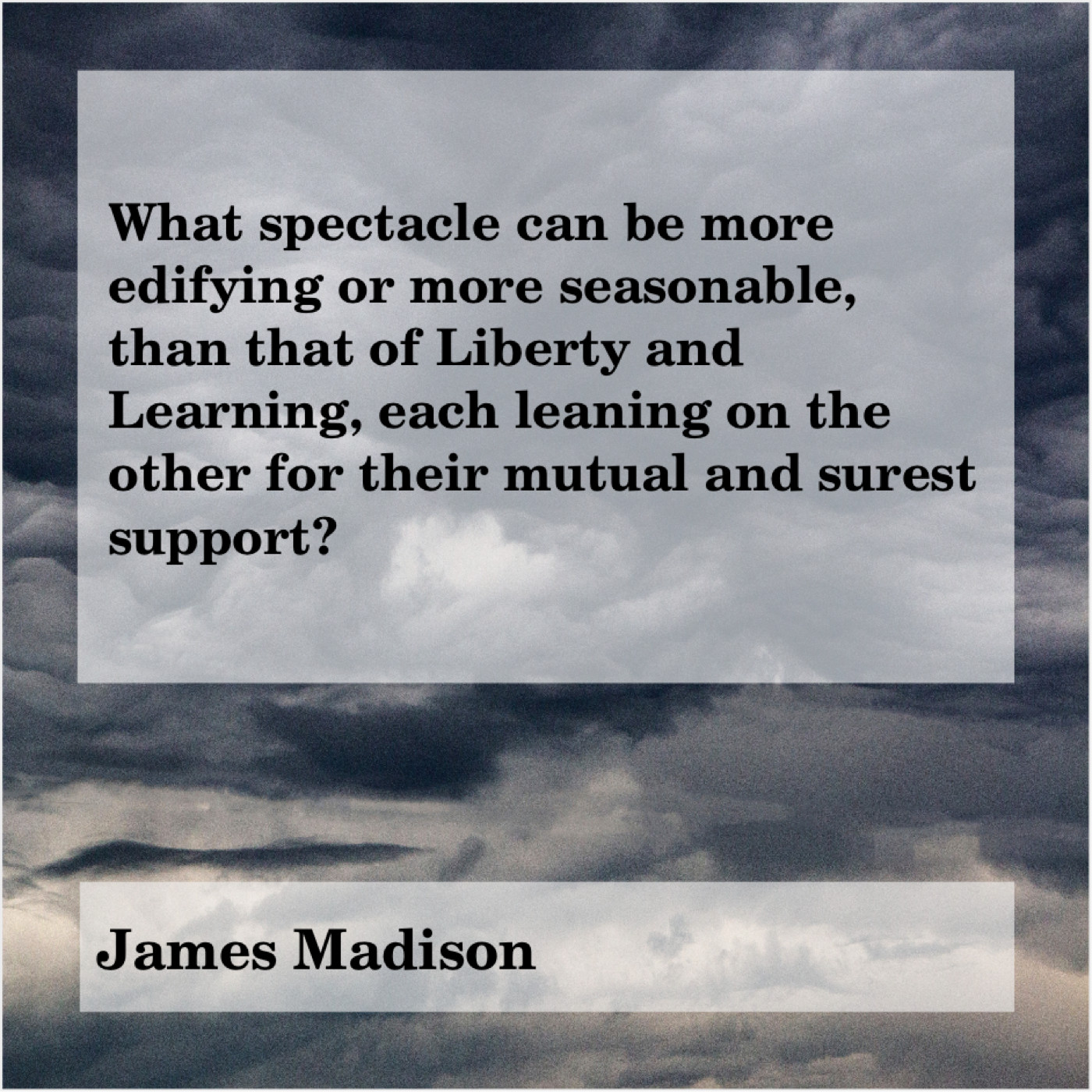 James Madison James Madison – What spectacle can be more… April 23, 2019 admin “What spectacle can be more edifying or more seasonable, than that of Liberty and Learning, each leaning on the other for their mutual and surest support?”-James Madison