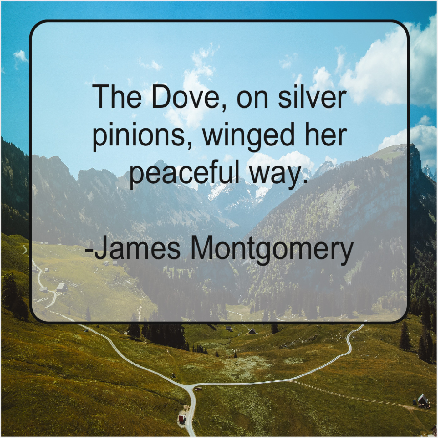 James Montgomery James Montgomery – The Dove, on silver pinions… July 1, 2019 admin “The Dove, on silver pinions, winged her peaceful way.”-James Montgomery