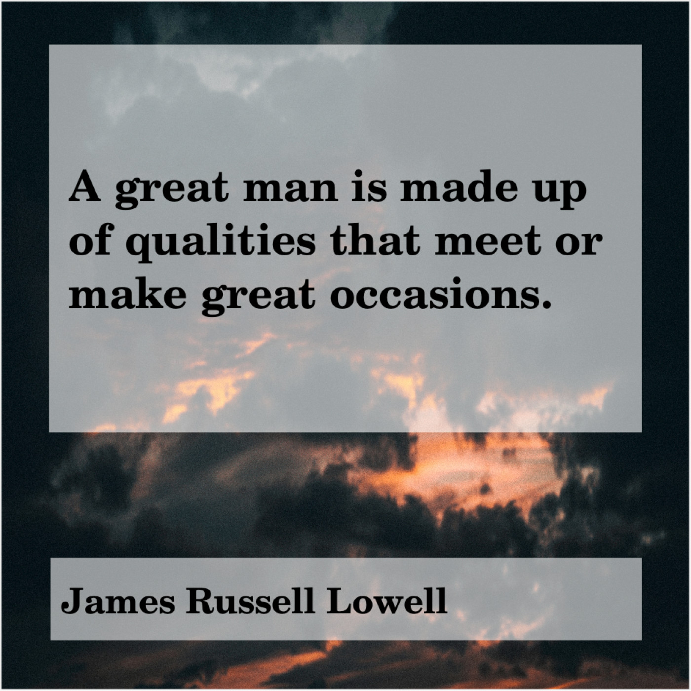 James Russell Lowell James Russell Lowell – A great man is made… January 31, 2019 admin “A great man is made up of qualities that meet or make great occasions.”-James Russell Lowell