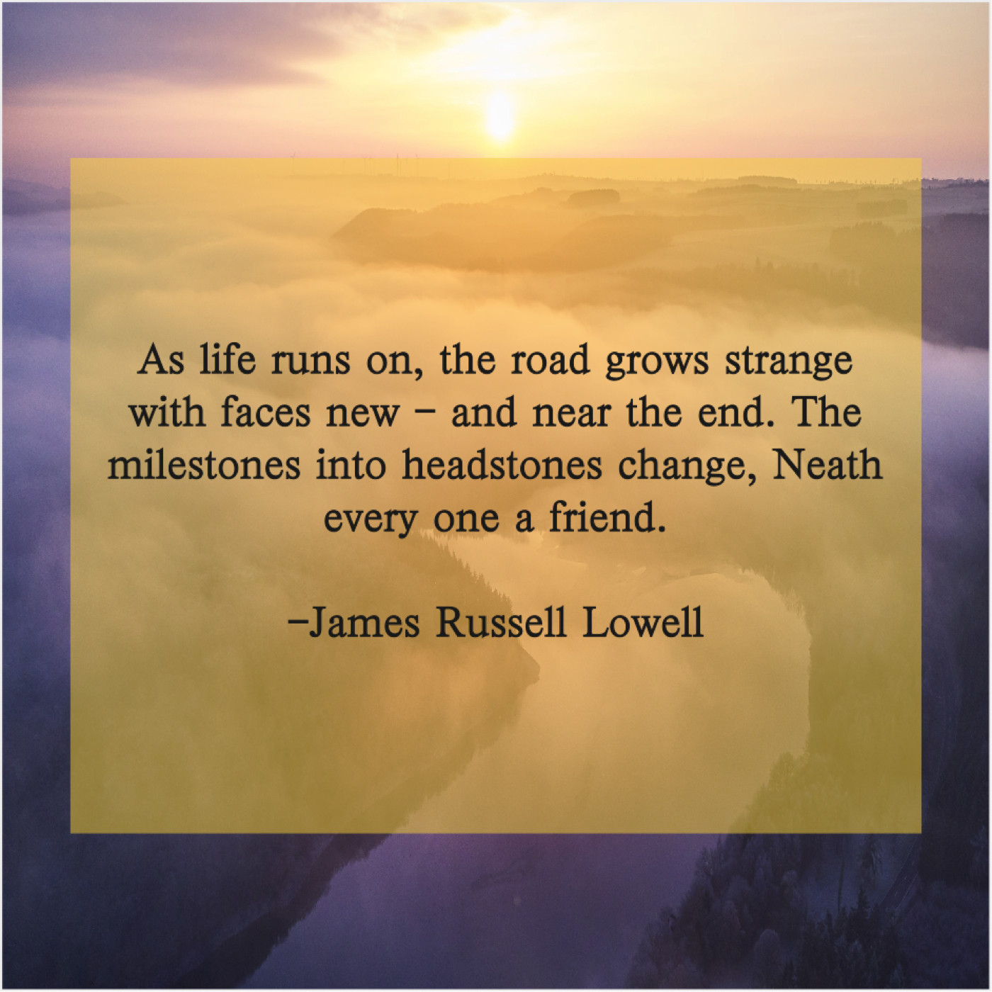 James Russell Lowell James Russell Lowell – As life runs on, the… November 11, 2018 admin “As life runs on, the road grows strange with faces new – and near the end. The milestones into headstones change, Neath every one a friend.”-James Russell Lowell