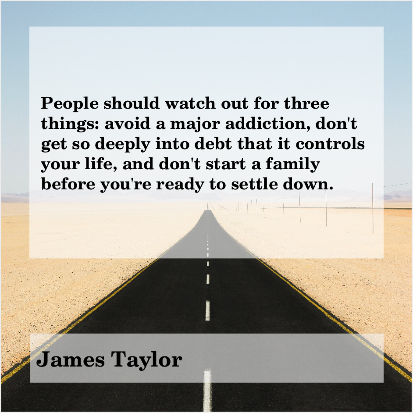 James Taylor James Taylor – People should watch out for… July 11, 2019 admin “People should watch out for three things: avoid a major addiction, don’t get so deeply into debt that it controls your life, and don’t start a family before you’re ready to settle down.”-James Taylor