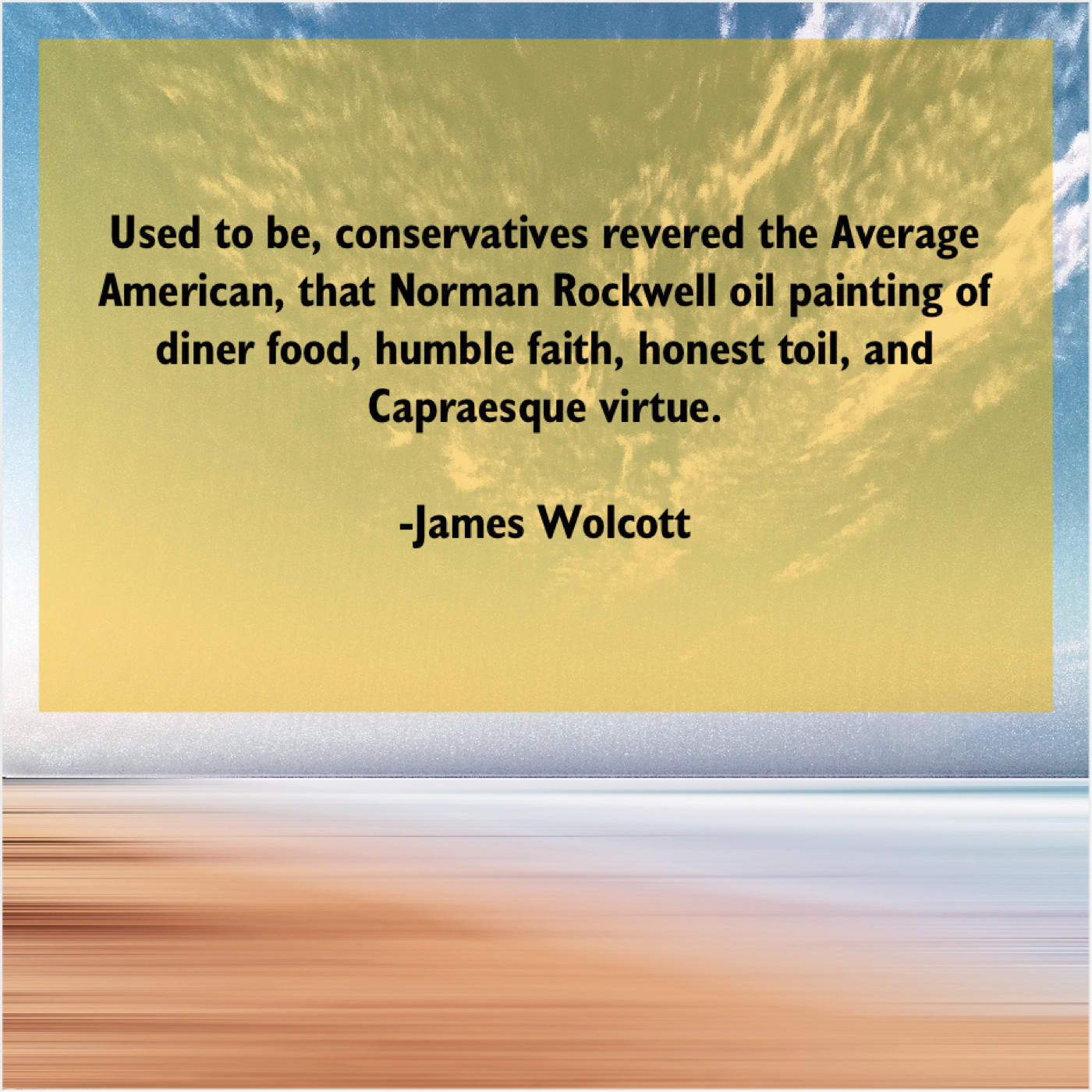 James Wolcott James Wolcott – Used to be, conservatives revered… May 12, 2019 admin “Used to be, conservatives revered the Average American, that Norman Rockwell oil painting of diner food, humble faith, honest toil, and Capraesque virtue.”-James Wolcott
