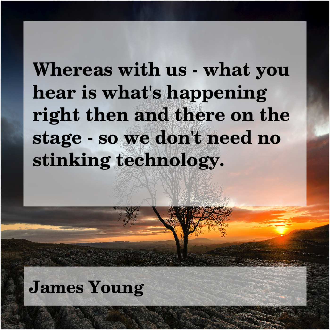 James Young James Young – Whereas with us – what you… August 16, 2019 admin “Whereas with us – what you hear is what’s happening right then and there on the stage – so we don’t need no stinking technology.”-James Young