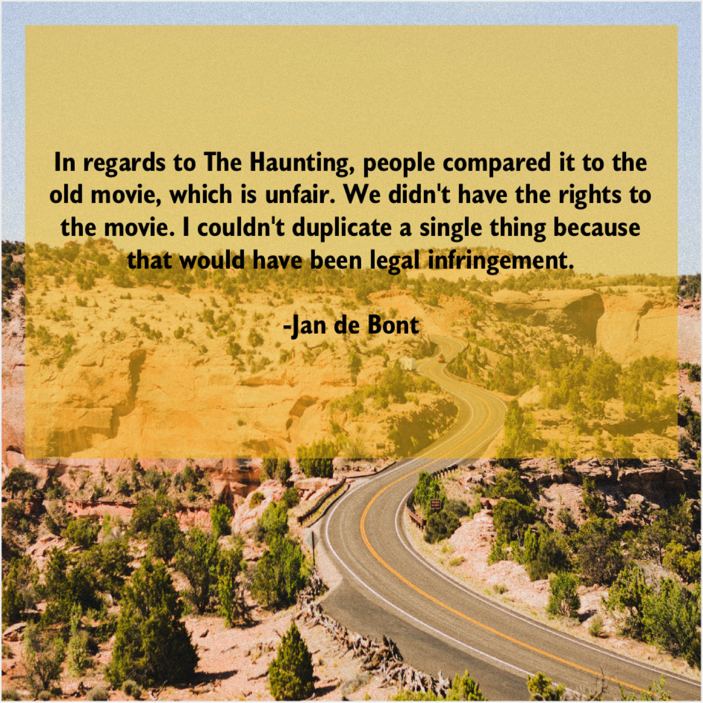 Jan de Bont Jan de Bont – In regards to The Haunting… July 30, 2019 admin “In regards to The Haunting, people compared it to the old movie, which is unfair. We didn’t have the rights to the movie. I couldn’t duplicate a single thing because that would have been legal infringement.”-Jan de Bont