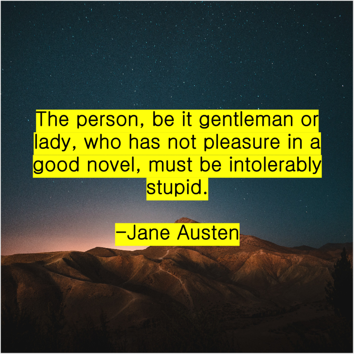 Jane Austen Jane Austen – The person, be it gentleman… November 29, 2018 admin “The person, be it gentleman or lady, who has not pleasure in a good novel, must be intolerably stupid.”-Jane Austen