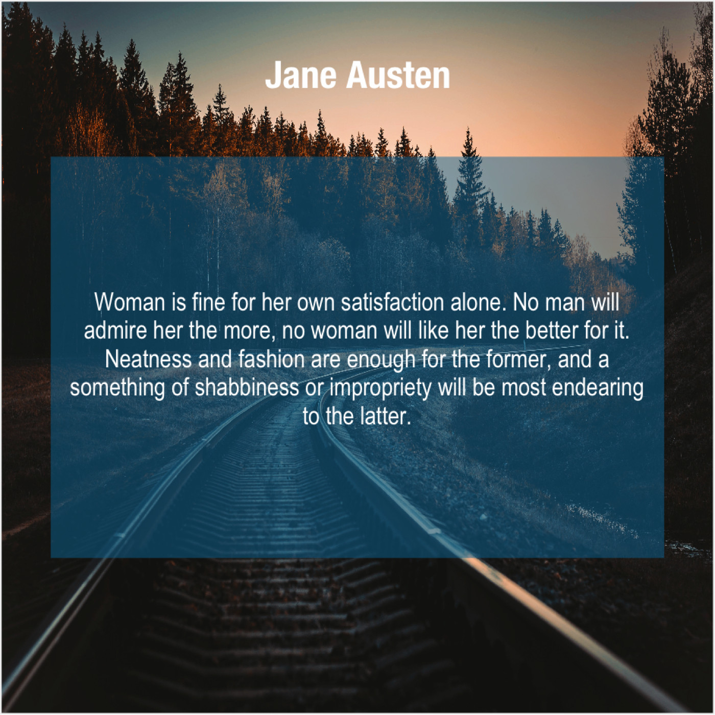 “Woman is fine for her own satisfaction alone. No man will admire her the more, no woman will like her the better for it. Neatness and fashion are enough for the former, and a something of shabbiness or impropriety will be most endearing to the latter.”