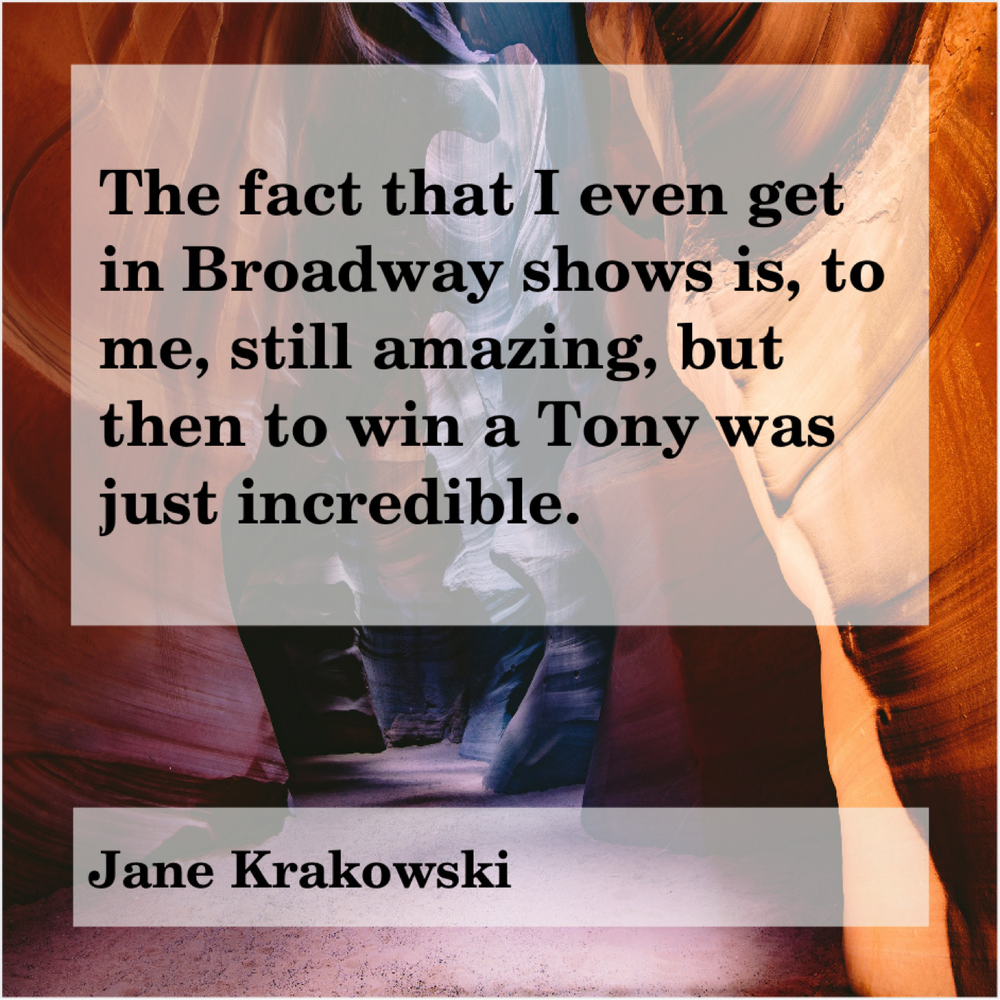 Jane Krakowski Jane Krakowski – The fact that I even… July 27, 2019 admin “The fact that I even get in Broadway shows is, to me, still amazing, but then to win a Tony was just incredible.”-Jane Krakowski