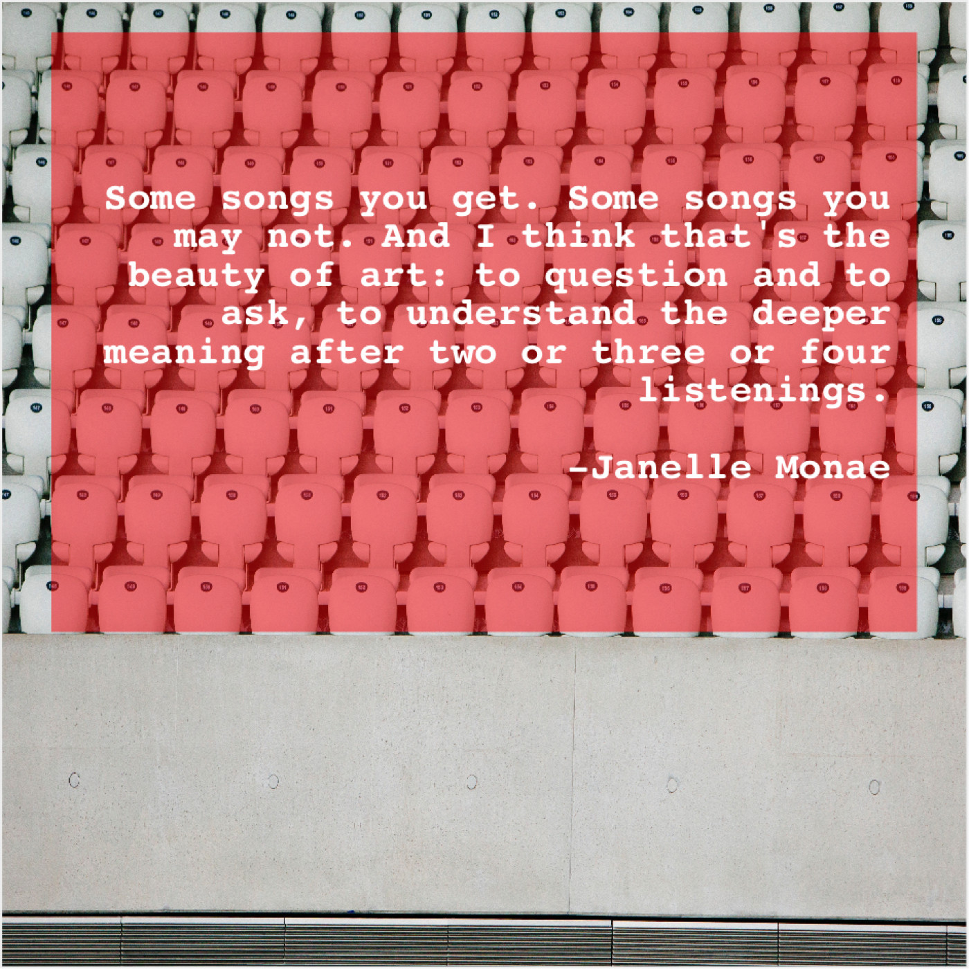 Janelle Monae Janelle Monae – Some songs you get. Some… February 16, 2019 admin “Some songs you get. Some songs you may not. And I think that’s the beauty of art: to question and to ask, to understand the deeper meaning after two or three or four listenings.”-Janelle Monae
