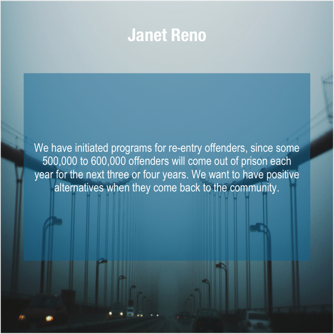 Janet Reno Janet Reno – We have initiated programs for… February 23, 2019 admin “We have initiated programs for re-entry offenders, since some 500,000 to 600,000 offenders will come out of prison each year for the next three or four years. We want to have positive alternatives when they come back to the community.”-Janet Reno