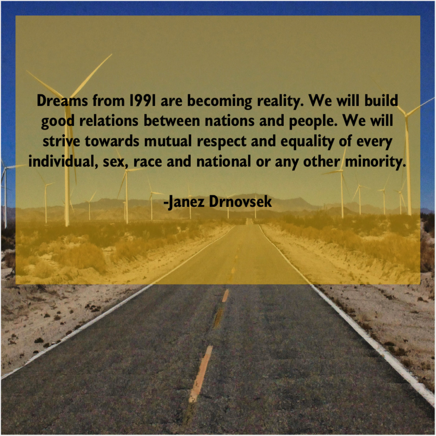 Janez Drnovsek Janez Drnovsek – Dreams from 1991 are becoming… February 10, 2019 admin “Dreams from 1991 are becoming reality. We will build good relations between nations and people. We will strive towards mutual respect and equality of every individual, sex, race and national or any other minority.”-Janez Drnovsek
