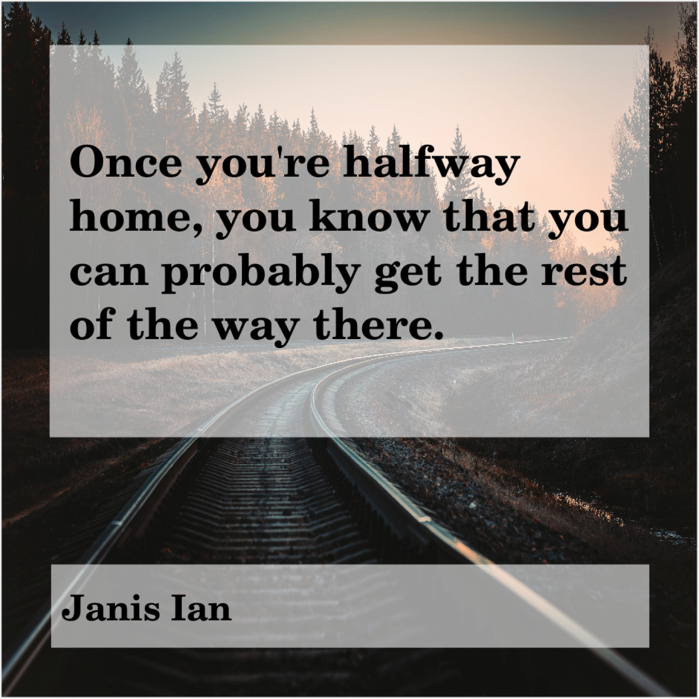 Janis Ian Janis Ian – Once you’re halfway home, you… October 9, 2019 admin “Once you’re halfway home, you know that you can probably get the rest of the way there.”-Janis Ian