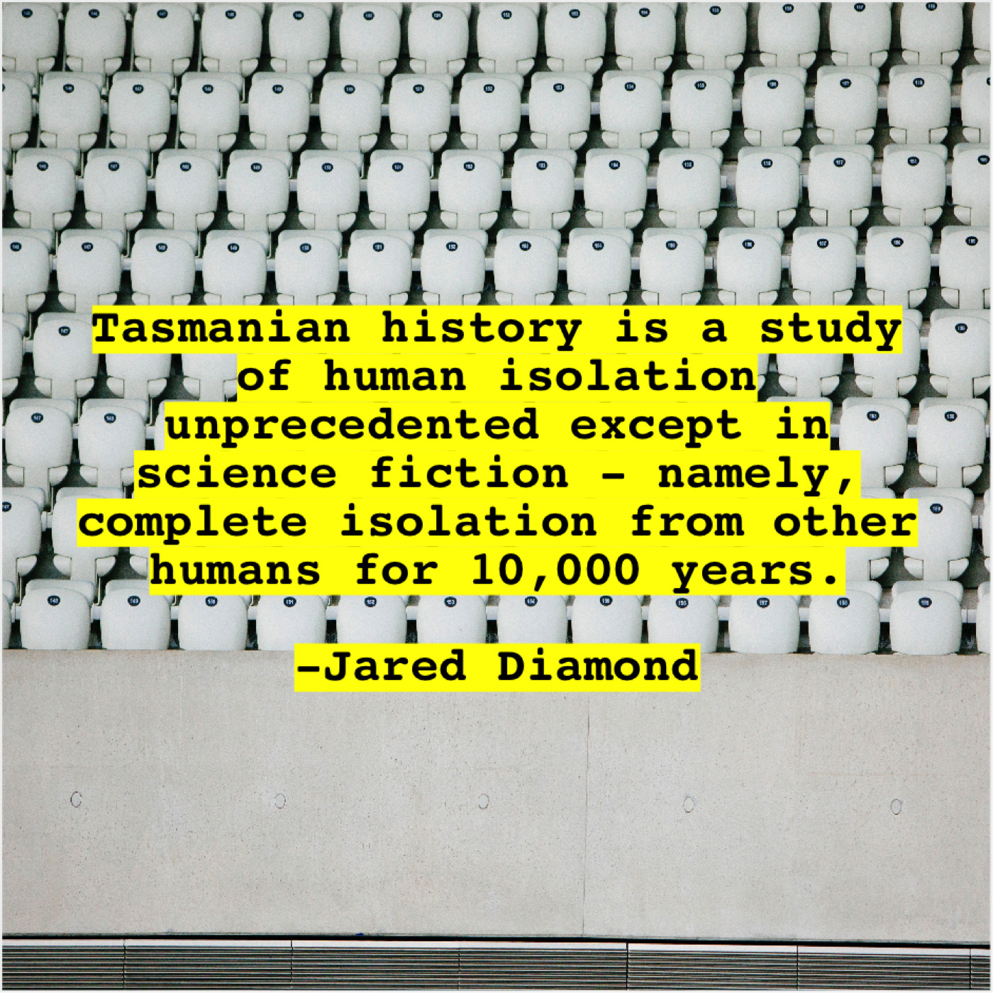 Jared Diamond Jared Diamond – Tasmanian history is a study… July 8, 2019 admin “Tasmanian history is a study of human isolation unprecedented except in science fiction – namely, complete isolation from other humans for 10,000 years.”-Jared Diamond
