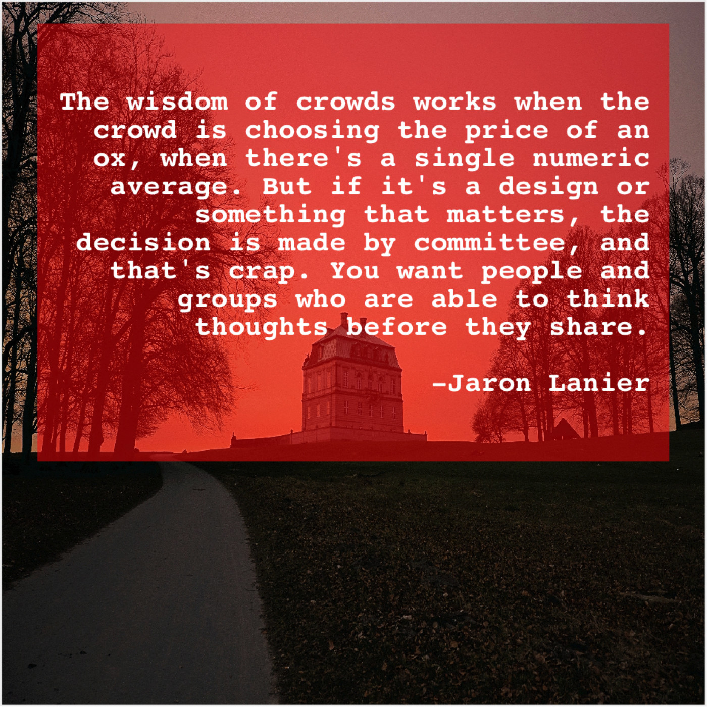 “The wisdom of crowds works when the crowd is choosing the price of an ox, when there’s a single numeric average. But if it’s a design or something that matters, the decision is made by committee, and that’s crap. You want people and groups who are able to think thoughts before they share.”