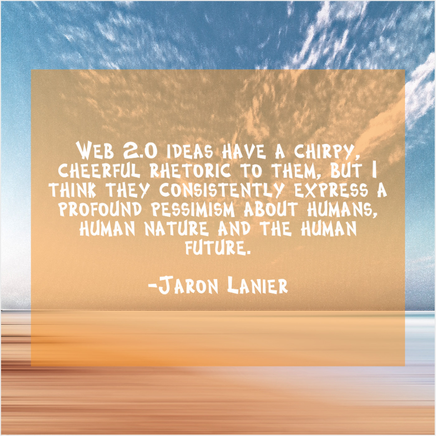 Jaron Lanier Jaron Lanier – Web 2.0 ideas have a… March 30, 2019 admin “Web 2.0 ideas have a chirpy, cheerful rhetoric to them, but I think they consistently express a profound pessimism about humans, human nature and the human future.”-Jaron Lanier