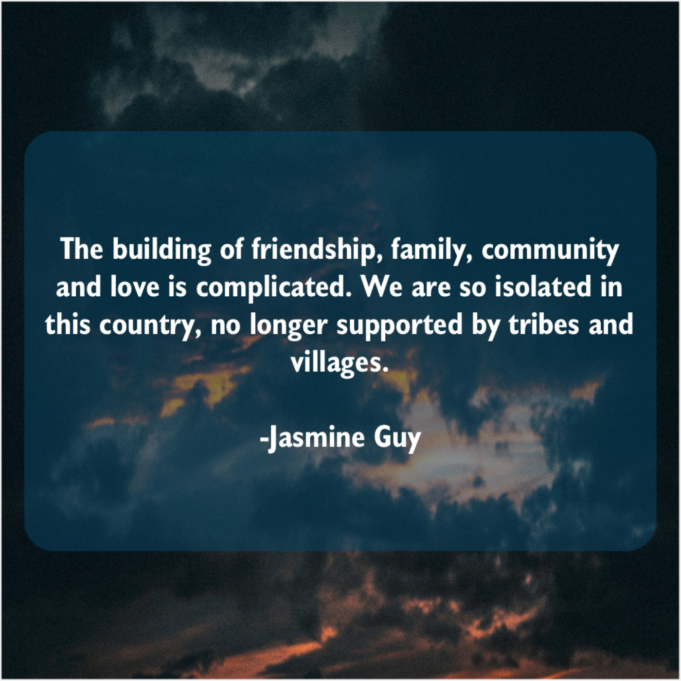 Jasmine Guy Jasmine Guy – The building of friendship, family… September 28, 2019 admin “The building of friendship, family, community and love is complicated. We are so isolated in this country, no longer supported by tribes and villages.”-Jasmine Guy