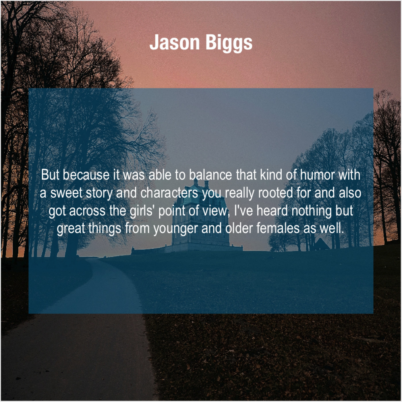 Jason Biggs Jason Biggs – But because it was able… February 17, 2019 admin “But because it was able to balance that kind of humor with a sweet story and characters you really rooted for and also got across the girls’ point of view, I’ve heard nothing but great things from younger and older females as well.”-Jason Biggs