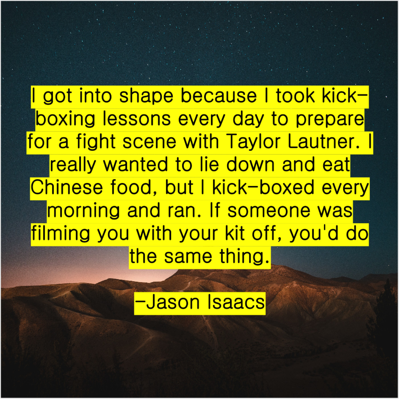 “I got into shape because I took kick-boxing lessons every day to prepare for a fight scene with Taylor Lautner. I really wanted to lie down and eat Chinese food, but I kick-boxed every morning and ran. If someone was filming you with your kit off, you’d do the same thing.”