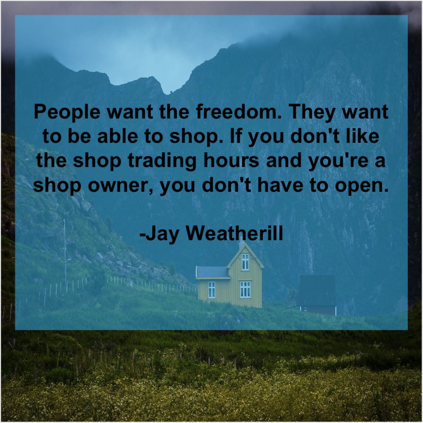 Jay Weatherill Jay Weatherill – People want the freedom. They… December 7, 2018 admin “People want the freedom. They want to be able to shop. If you don’t like the shop trading hours and you’re a shop owner, you don’t have to open.”-Jay Weatherill