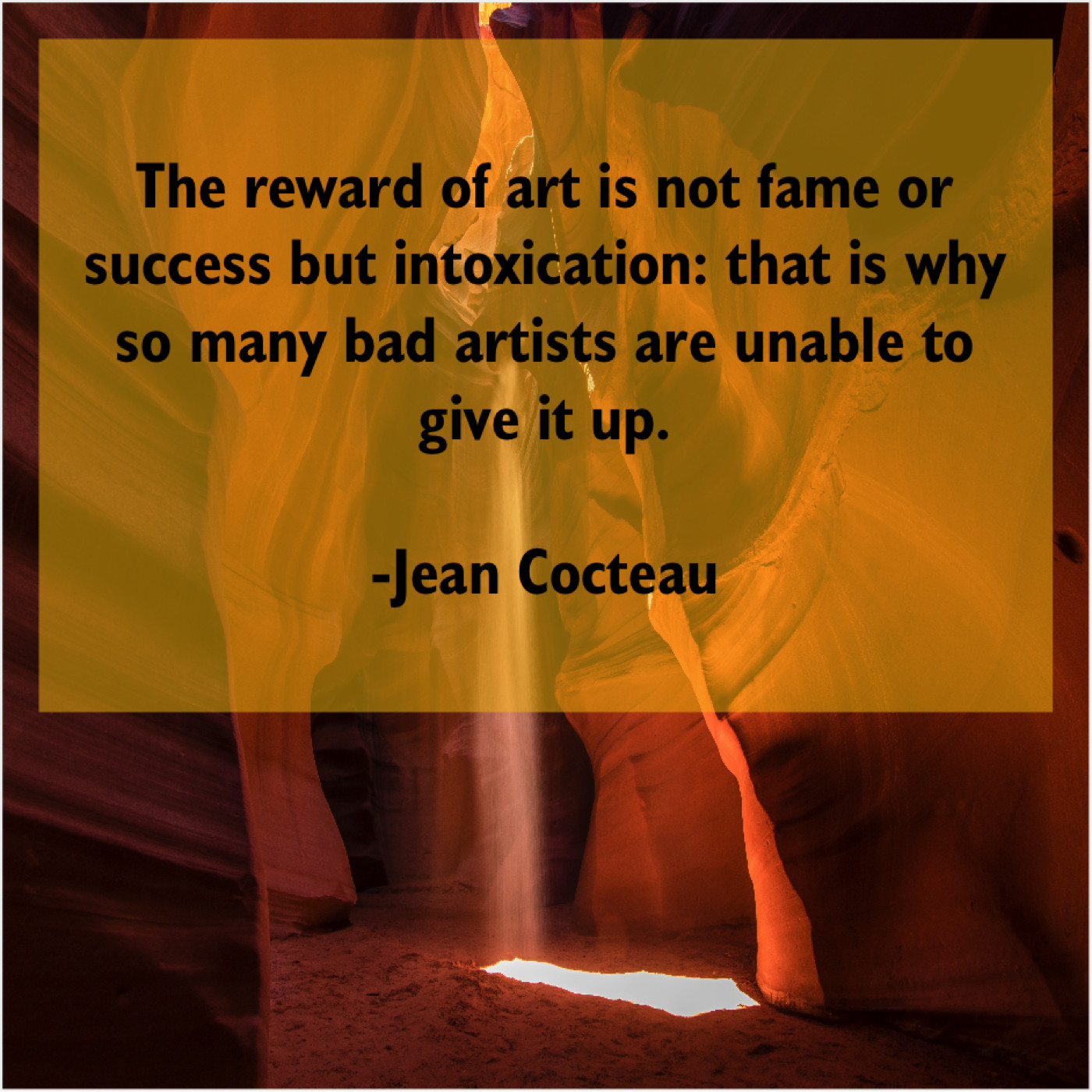 Jean Cocteau Jean Cocteau – The reward of art is… March 24, 2019 admin “The reward of art is not fame or success but intoxication: that is why so many bad artists are unable to give it up.”-Jean Cocteau