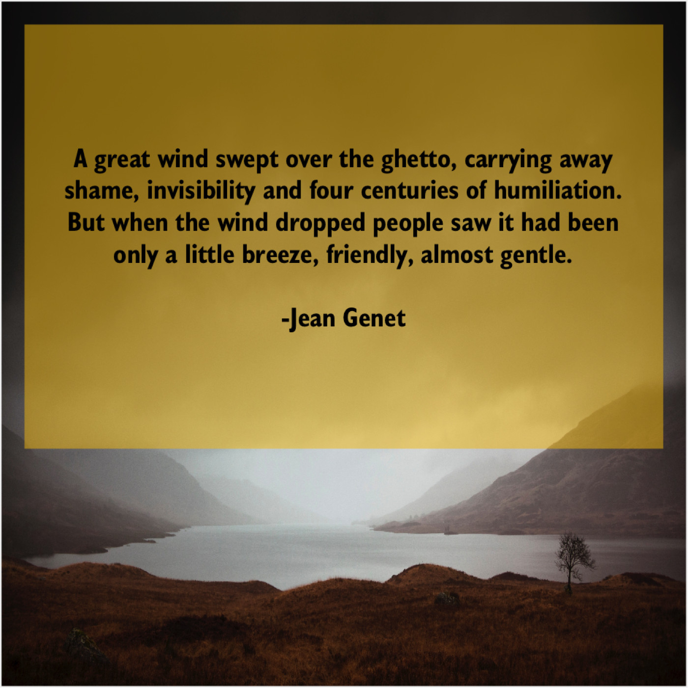 Jean Genet Jean Genet – A great wind swept over… March 14, 2019 admin “A great wind swept over the ghetto, carrying away shame, invisibility and four centuries of humiliation. But when the wind dropped people saw it had been only a little breeze, friendly, almost gentle.”-Jean Genet