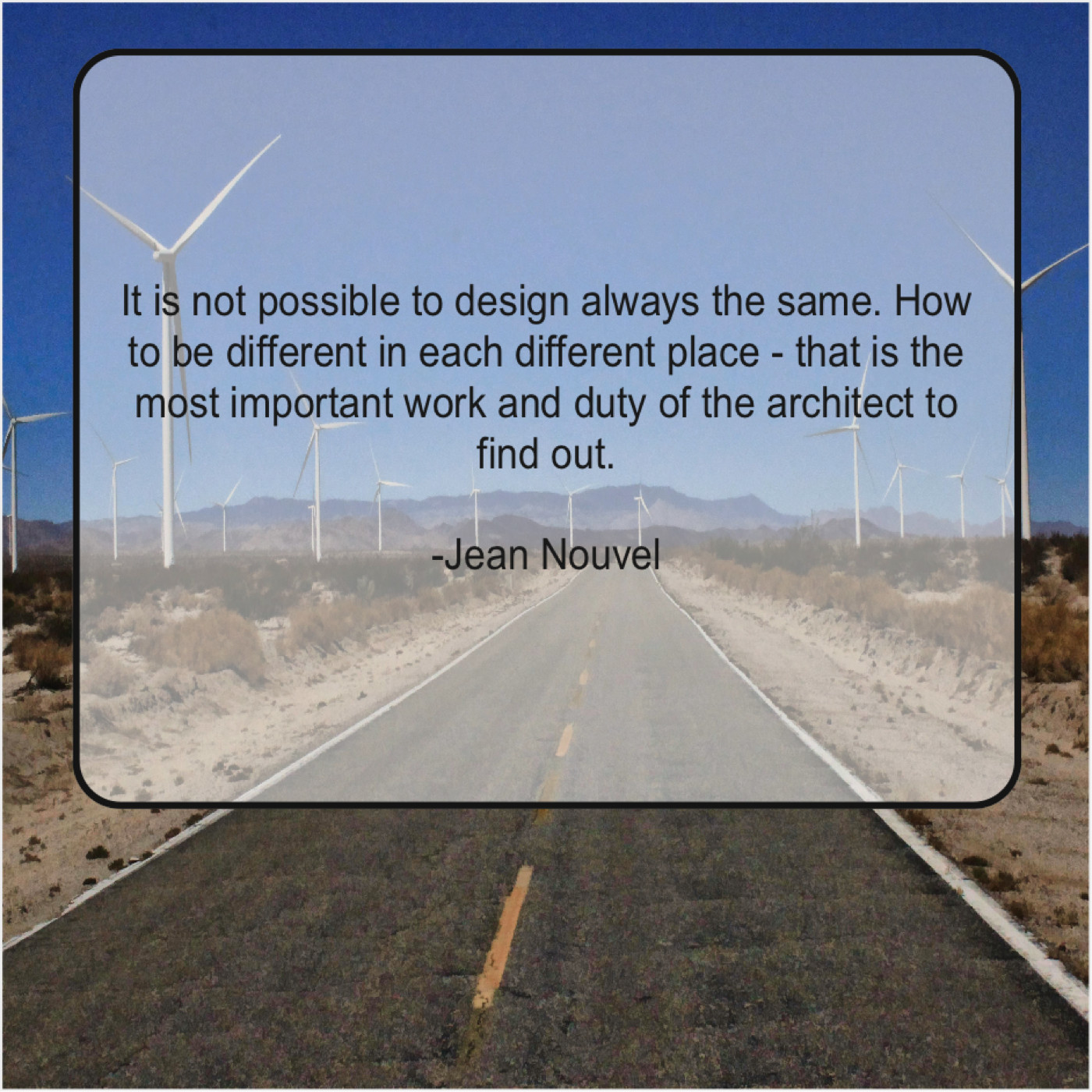 Jean Nouvel Jean Nouvel – It is not possible to… January 17, 2019 admin “It is not possible to design always the same. How to be different in each different place – that is the most important work and duty of the architect to find out.”-Jean Nouvel