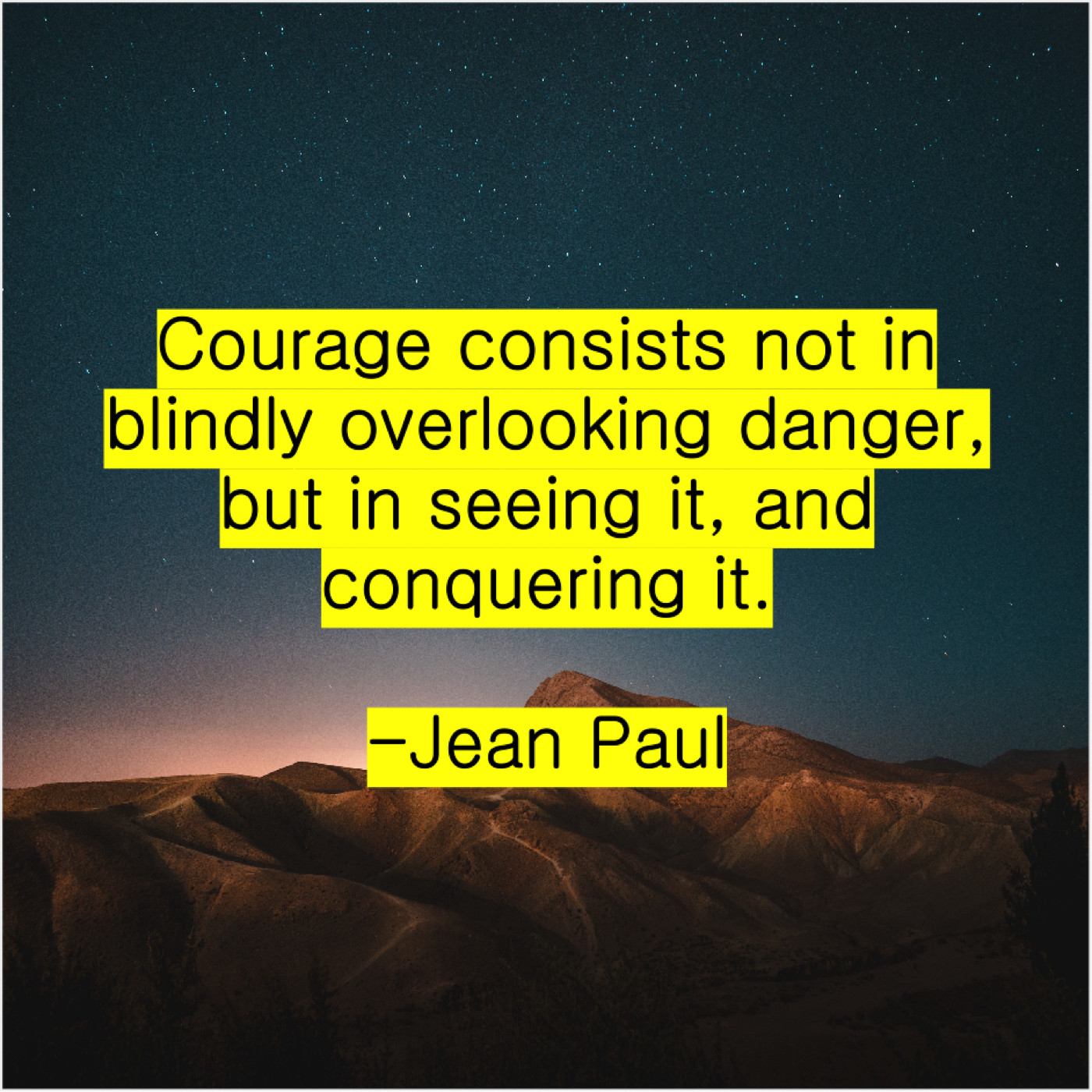 Jean Paul Jean Paul – Courage consists not in blindly… July 31, 2019 admin “Courage consists not in blindly overlooking danger, but in seeing it, and conquering it.”-Jean Paul