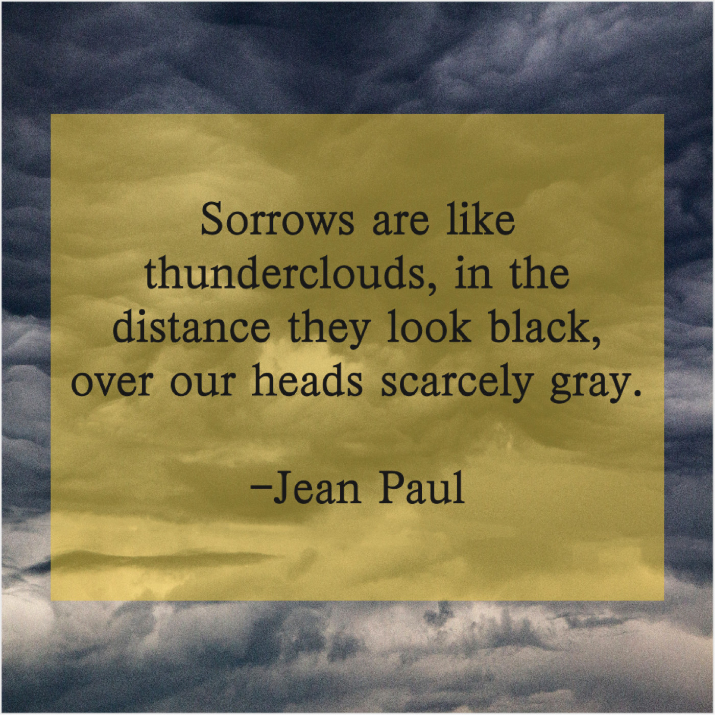 Jean Paul Jean Paul – Sorrows are like thunderclouds, in… July 19, 2019 admin “Sorrows are like thunderclouds, in the distance they look black, over our heads scarcely gray.”-Jean Paul