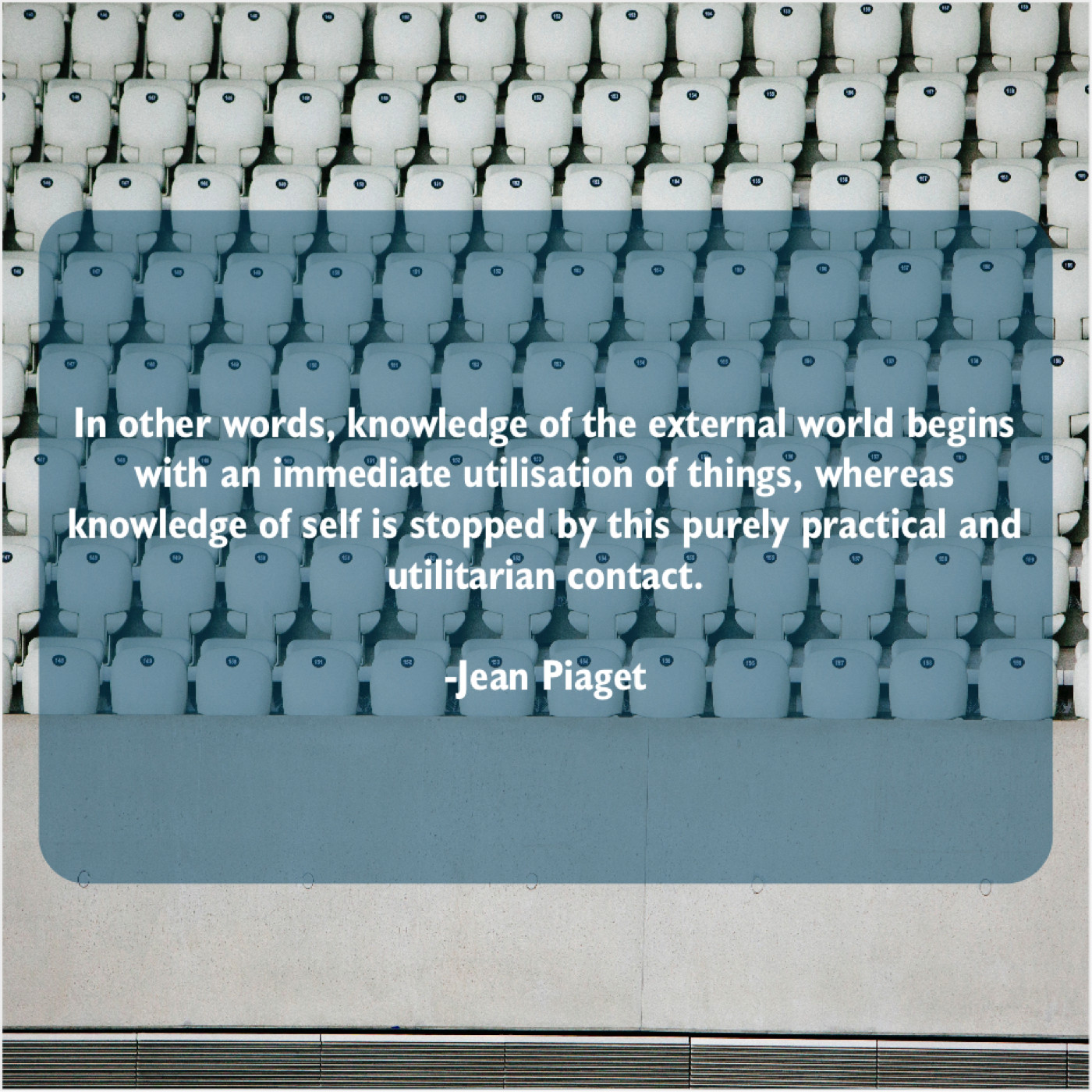 Jean Piaget Jean Piaget – In other words, knowledge of… December 17, 2018 admin “In other words, knowledge of the external world begins with an immediate utilisation of things, whereas knowledge of self is stopped by this purely practical and utilitarian contact.”-Jean Piaget