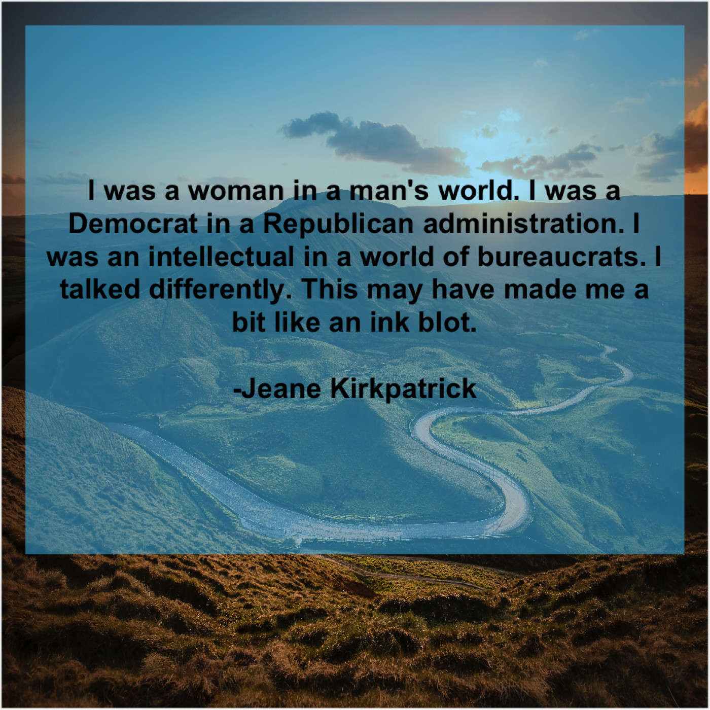 Jeane Kirkpatrick Jeane Kirkpatrick – I was a woman in… March 15, 2019 admin “I was a woman in a man’s world. I was a Democrat in a Republican administration. I was an intellectual in a world of bureaucrats. I talked differently. This may have made me a bit like an ink blot.”-Jeane Kirkpatrick