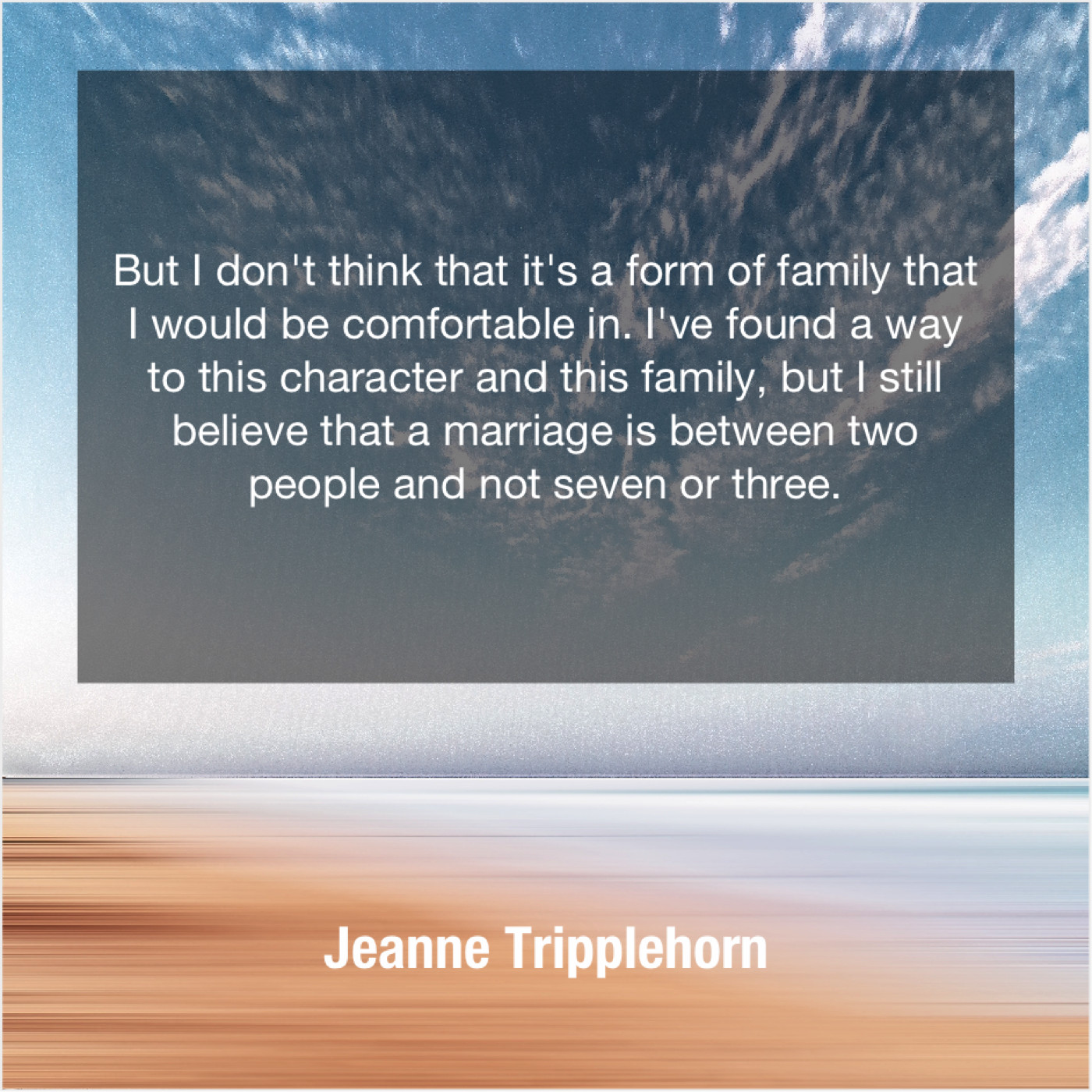Jeanne Tripplehorn Jeanne Tripplehorn – But I don’t think that… February 7, 2019 admin “But I don’t think that it’s a form of family that I would be comfortable in. I’ve found a way to this character and this family, but I still believe that a marriage is between two people and not seven or three.”-Jeanne Tripplehorn