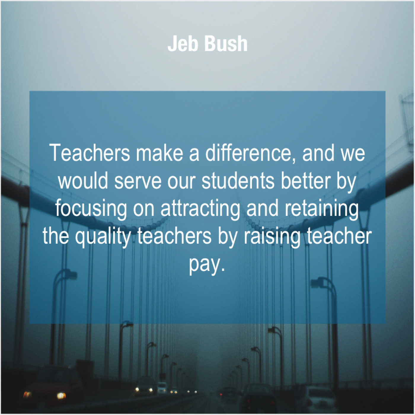 Jeb Bush Jeb Bush – Teachers make a difference, and… October 17, 2019 admin “Teachers make a difference, and we would serve our students better by focusing on attracting and retaining the quality teachers by raising teacher pay.”-Jeb Bush