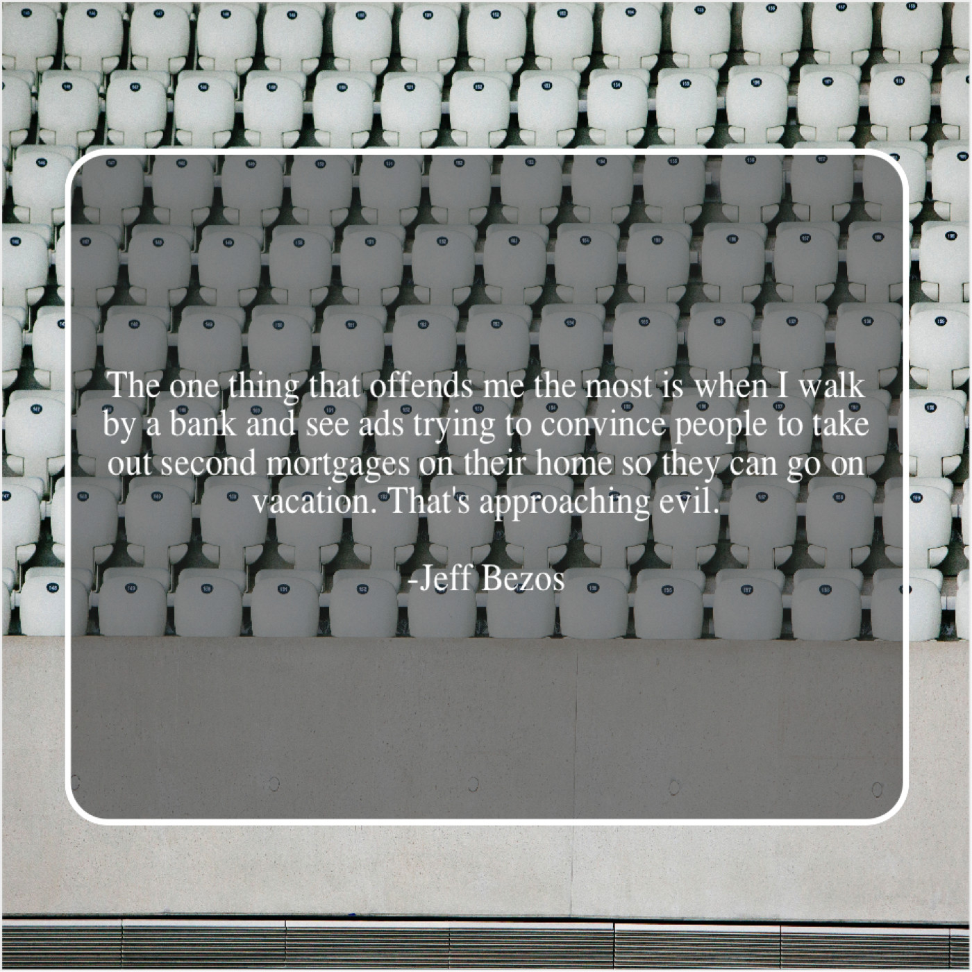 Jeff Bezos Jeff Bezos – The one thing that offends… December 13, 2018 admin “The one thing that offends me the most is when I walk by a bank and see ads trying to convince people to take out second mortgages on their home so they can go on vacation. That’s approaching evil.”-Jeff Bezos