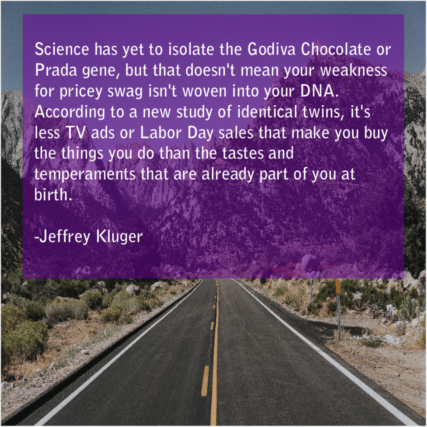 “Science has yet to isolate the Godiva Chocolate or Prada gene, but that doesn’t mean your weakness for pricey swag isn’t woven into your DNA. According to a new study of identical twins, it’s less TV ads or Labor Day sales that make you buy the things you do than the tastes and temperaments that are already part of you at birth.”