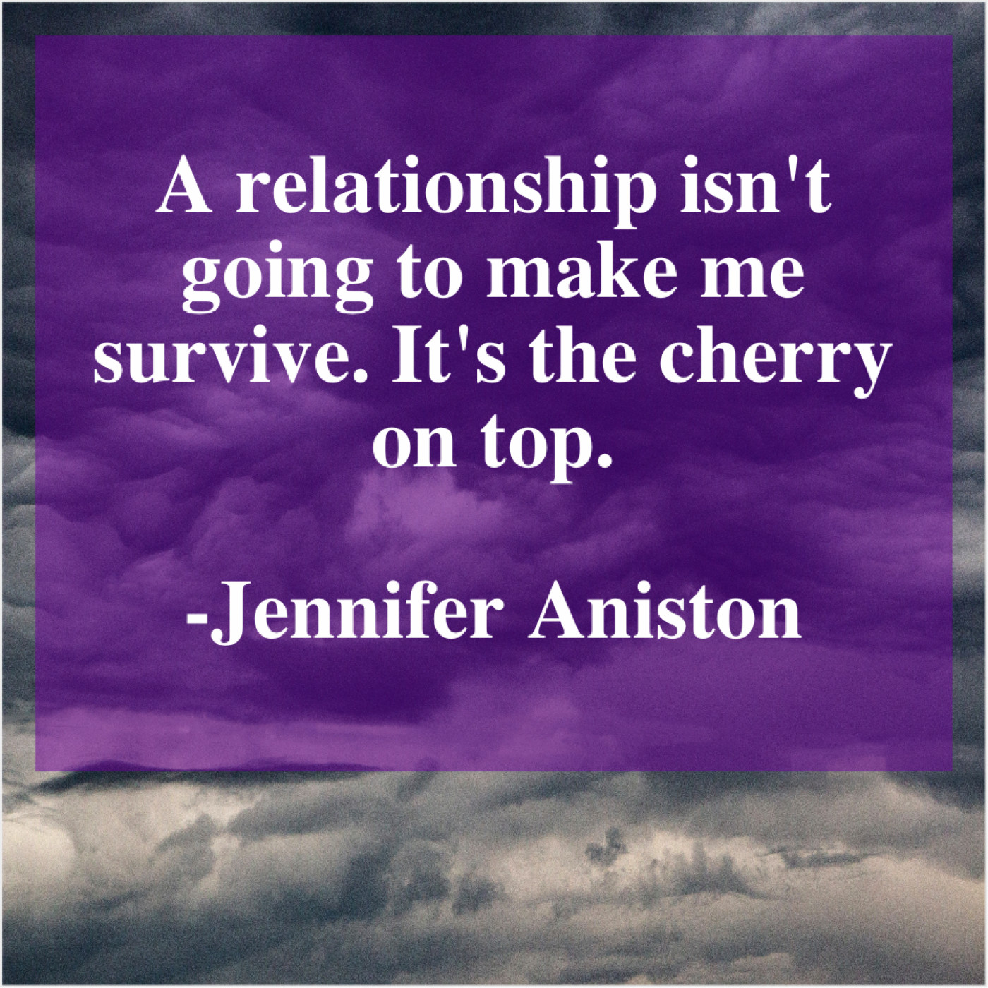 Jennifer Aniston Jennifer Aniston – A relationship isn’t going to… May 18, 2019 admin “A relationship isn’t going to make me survive. It’s the cherry on top.”-Jennifer Aniston