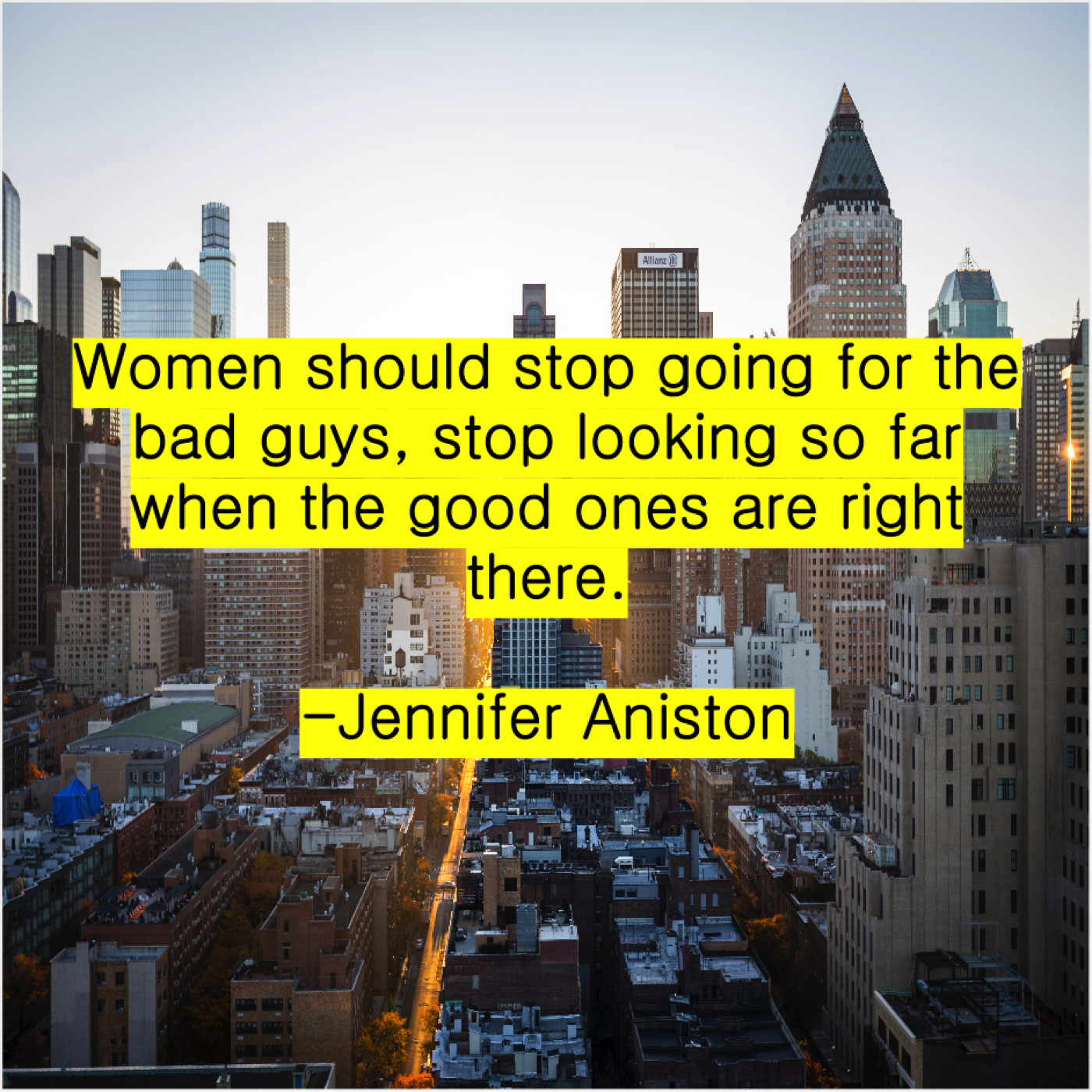 Jennifer Aniston Jennifer Aniston – Women should stop going for… July 12, 2019 admin “Women should stop going for the bad guys, stop looking so far when the good ones are right there.”-Jennifer Aniston