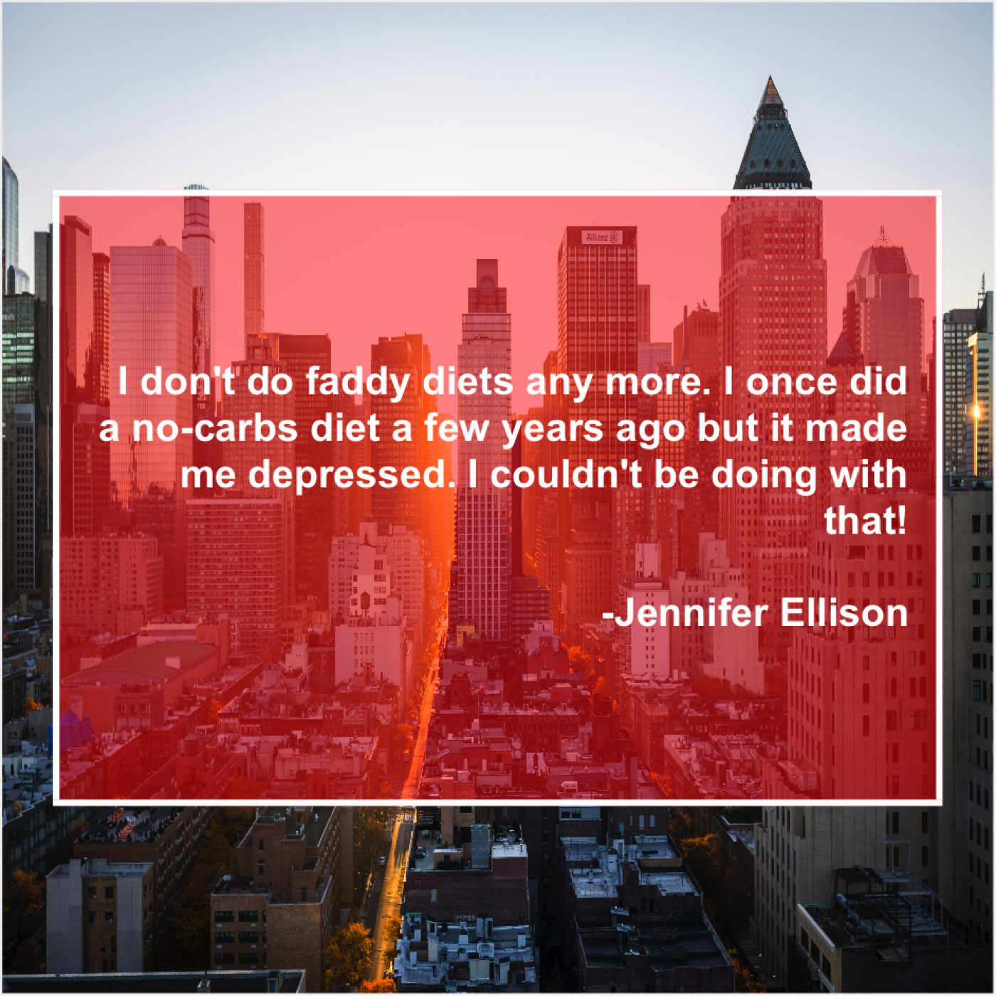 Jennifer Ellison Jennifer Ellison – I don’t do faddy diets… July 18, 2019 admin “I don’t do faddy diets any more. I once did a no-carbs diet a few years ago but it made me depressed. I couldn’t be doing with that!”-Jennifer Ellison