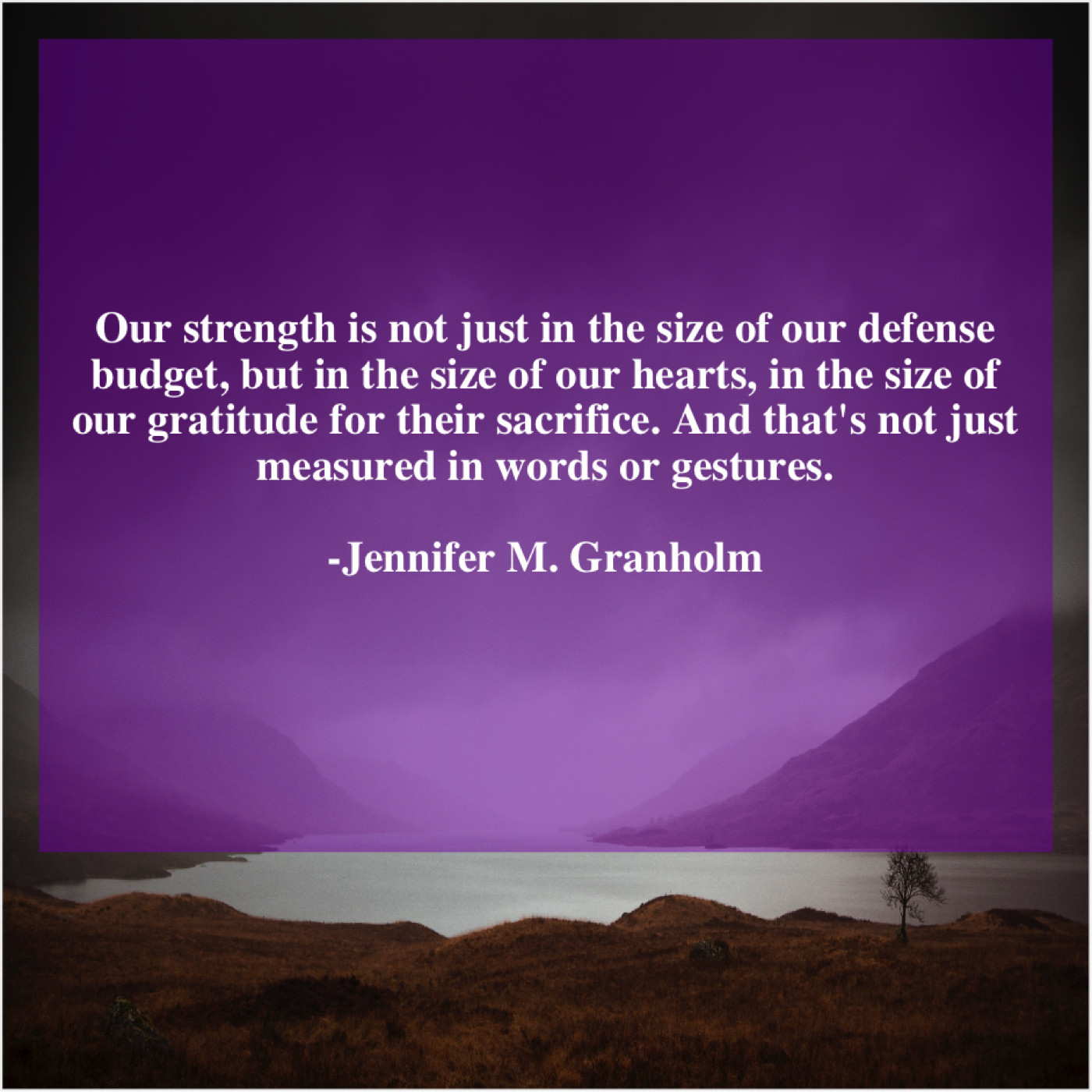 Jennifer M. Granholm Jennifer M. Granholm – Our strength is not just… August 29, 2019 admin “Our strength is not just in the size of our defense budget, but in the size of our hearts, in the size of our gratitude for their sacrifice. And that’s not just measured in words or gestures.”-Jennifer M. Granholm