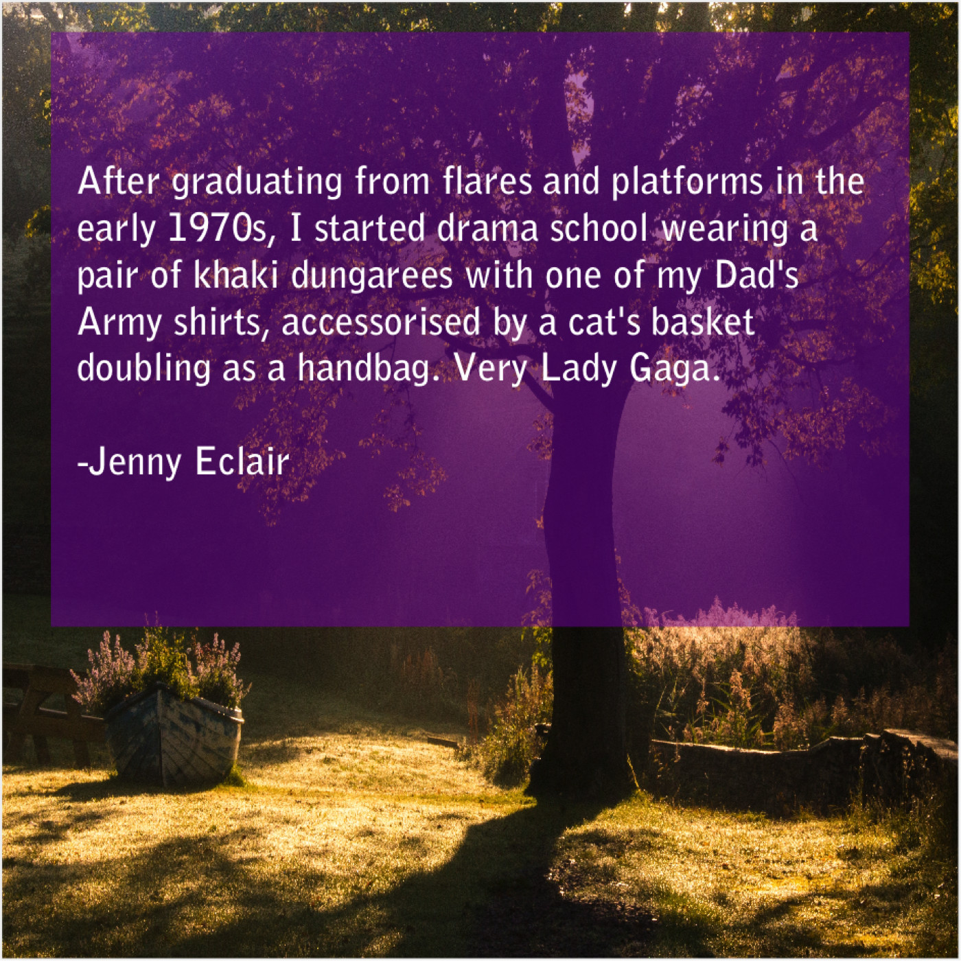 Jenny Eclair Jenny Eclair – After graduating from flares and… January 17, 2019 admin “After graduating from flares and platforms in the early 1970s, I started drama school wearing a pair of khaki dungarees with one of my Dad’s Army shirts, accessorised by a cat’s basket doubling as a handbag. Very Lady Gaga.”-Jenny Eclair