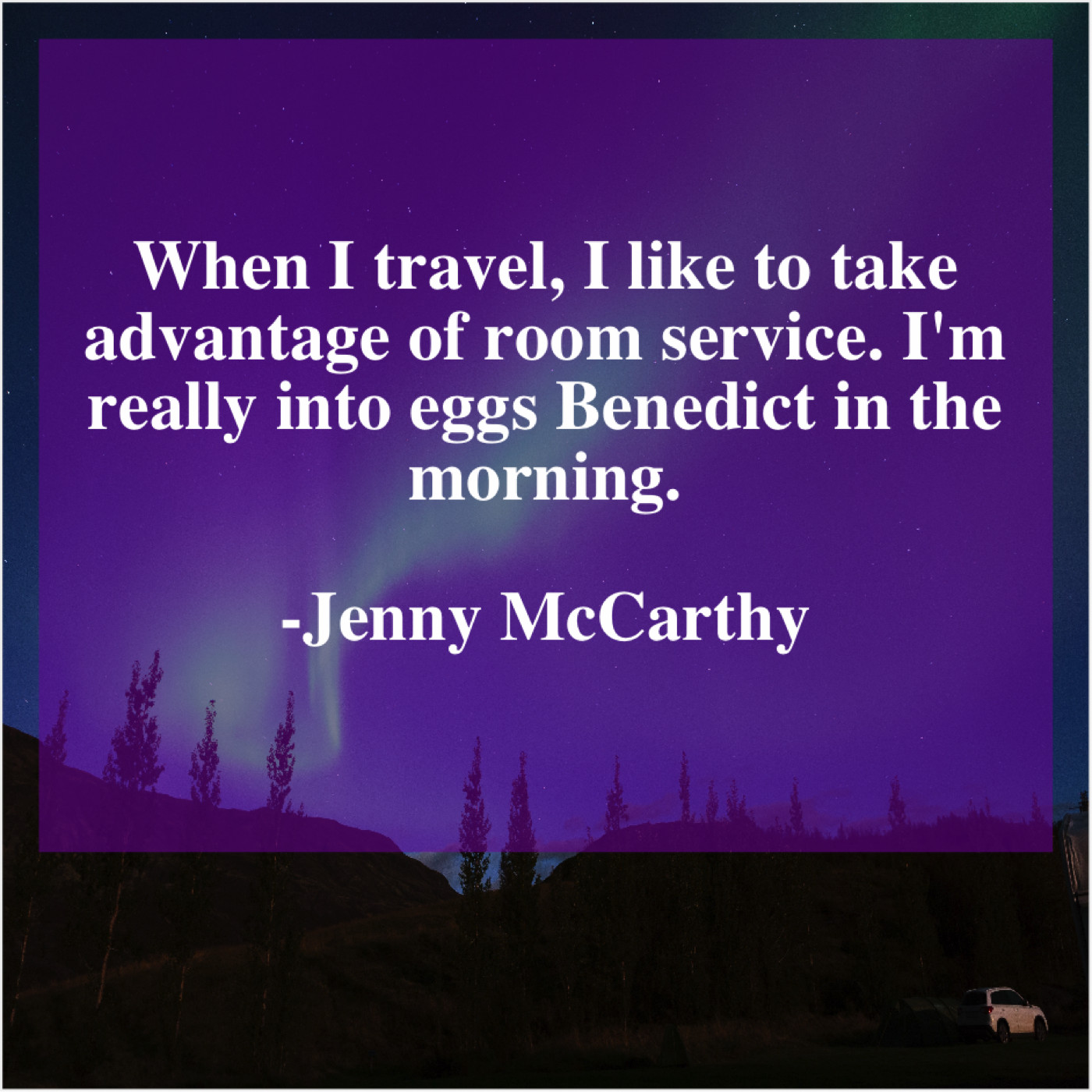 Jenny McCarthy Jenny McCarthy – When I travel, I like… January 17, 2019 admin “When I travel, I like to take advantage of room service. I’m really into eggs Benedict in the morning.”-Jenny McCarthy