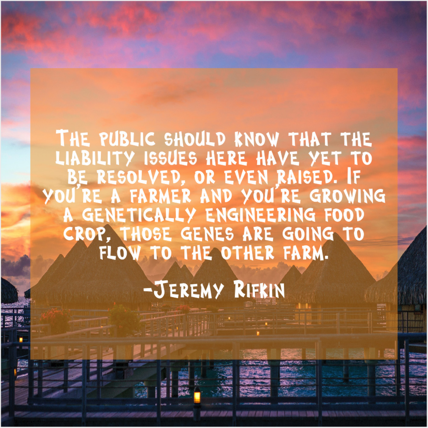 Jeremy Rifkin Jeremy Rifkin – The public should know that… December 21, 2018 admin “The public should know that the liability issues here have yet to be resolved, or even raised. If you’re a farmer and you’re growing a genetically engineering food crop, those genes are going to flow to the other farm.”-Jeremy Rifkin