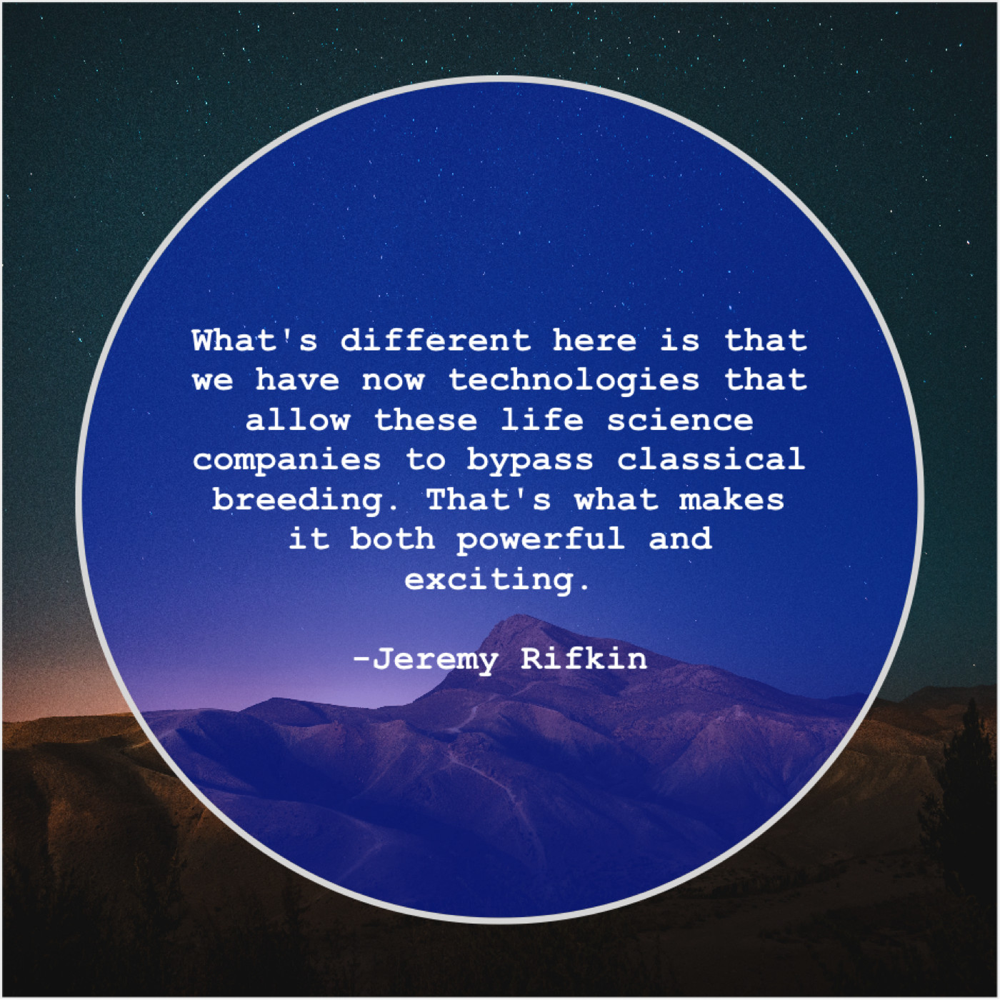 Jeremy Rifkin Jeremy Rifkin – What’s different here is that… October 3, 2019 admin “What’s different here is that we have now technologies that allow these life science companies to bypass classical breeding. That’s what makes it both powerful and exciting.”-Jeremy Rifkin