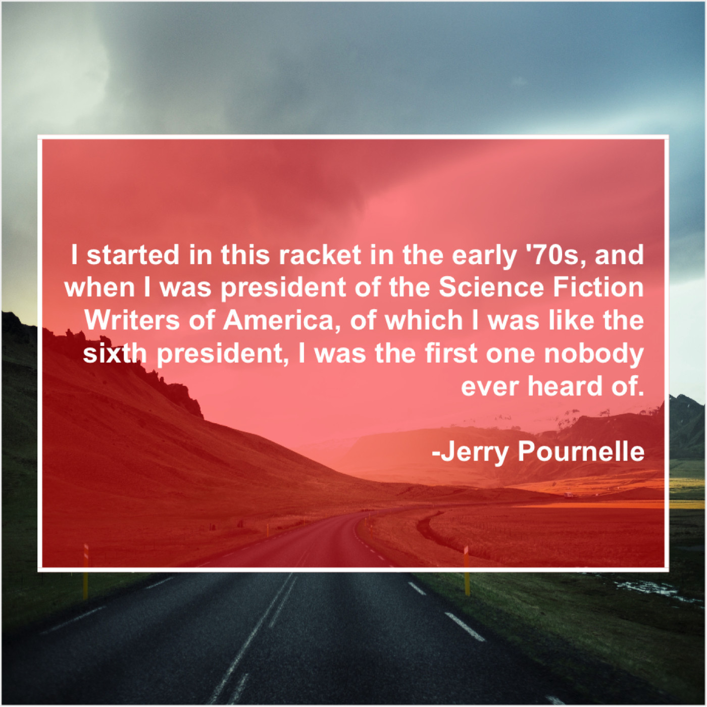 Jerry Pournelle Jerry Pournelle – I started in this racket… May 13, 2019 admin “I started in this racket in the early ’70s, and when I was president of the Science Fiction Writers of America, of which I was like the sixth president, I was the first one nobody ever heard of.”-Jerry Pournelle