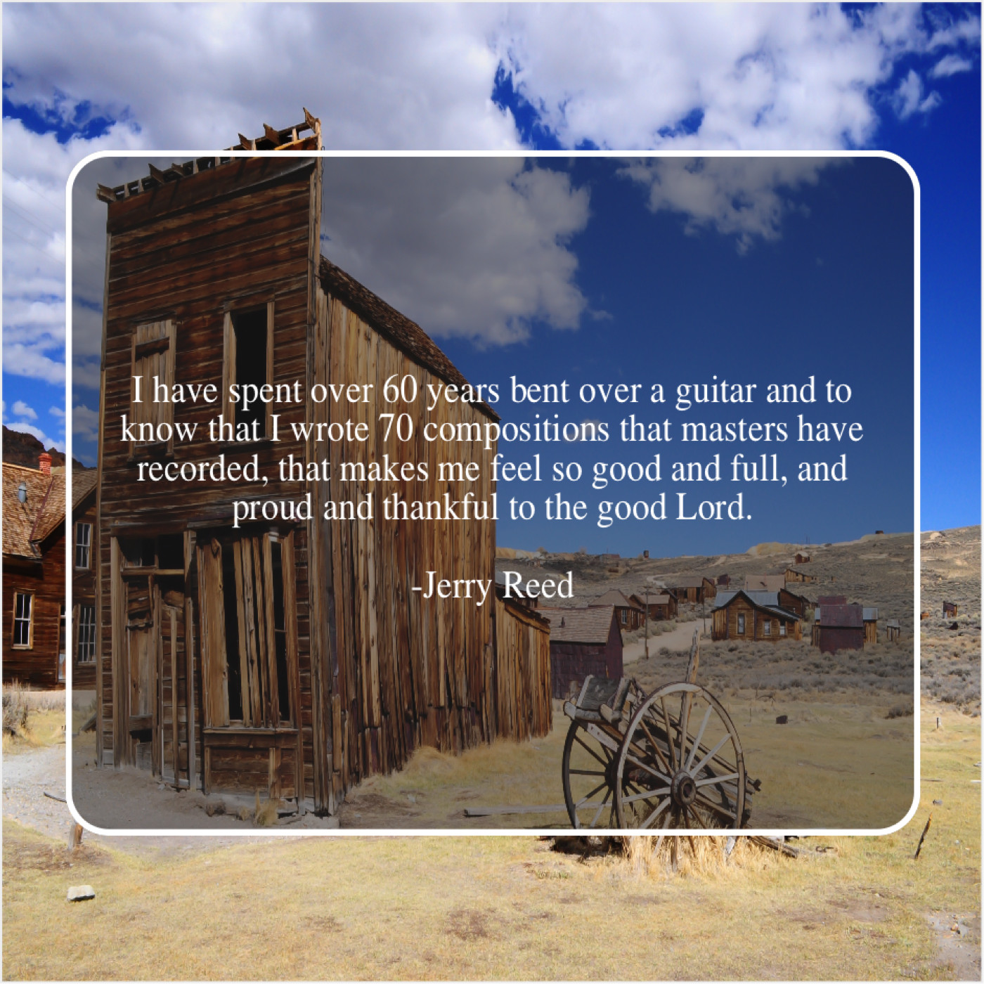 Jerry Reed Jerry Reed – I have spent over 60… June 15, 2019 admin “I have spent over 60 years bent over a guitar and to know that I wrote 70 compositions that masters have recorded, that makes me feel so good and full, and proud and thankful to the good Lord.”-Jerry Reed