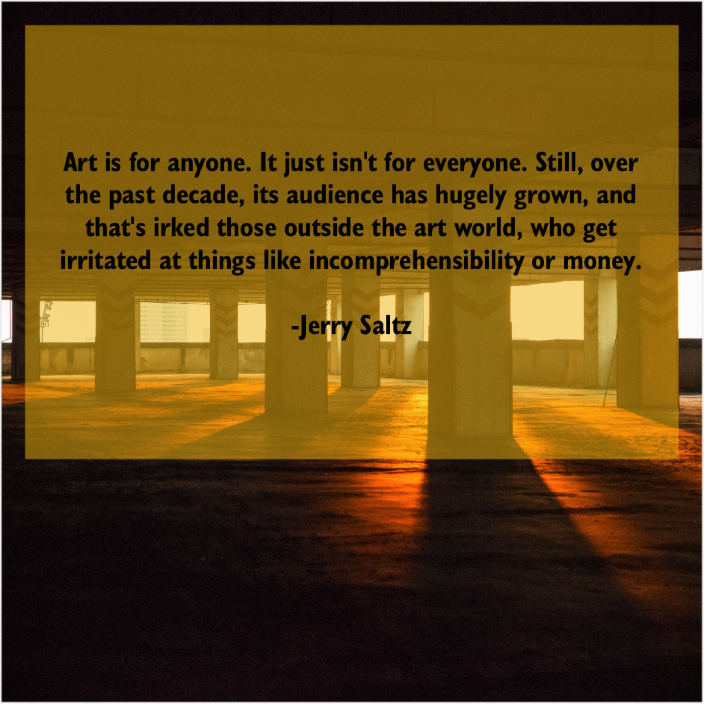 Jerry Saltz Jerry Saltz – Art is for anyone. It… June 14, 2019 admin “Art is for anyone. It just isn’t for everyone. Still, over the past decade, its audience has hugely grown, and that’s irked those outside the art world, who get irritated at things like incomprehensibility or money.”-Jerry Saltz