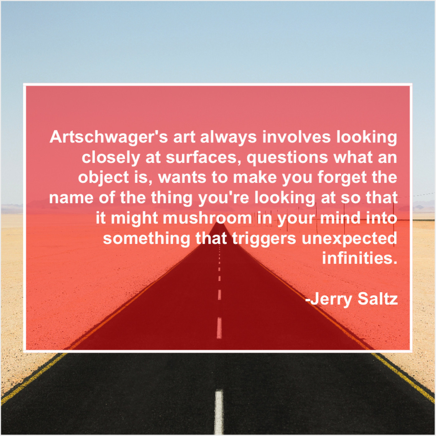 “Artschwager’s art always involves looking closely at surfaces, questions what an object is, wants to make you forget the name of the thing you’re looking at so that it might mushroom in your mind into something that triggers unexpected infinities.”