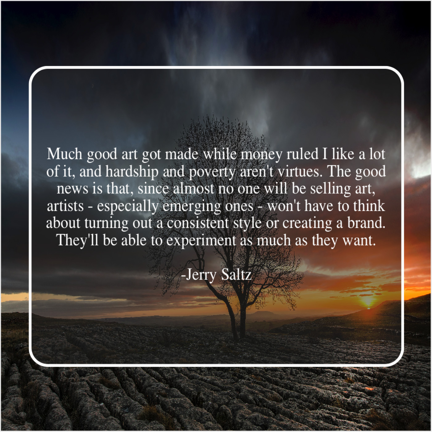 “Much good art got made while money ruled I like a lot of it, and hardship and poverty aren’t virtues. The good news is that, since almost no one will be selling art, artists – especially emerging ones – won’t have to think about turning out a consistent style or creating a brand. They’ll be able to experiment as much as they want.”