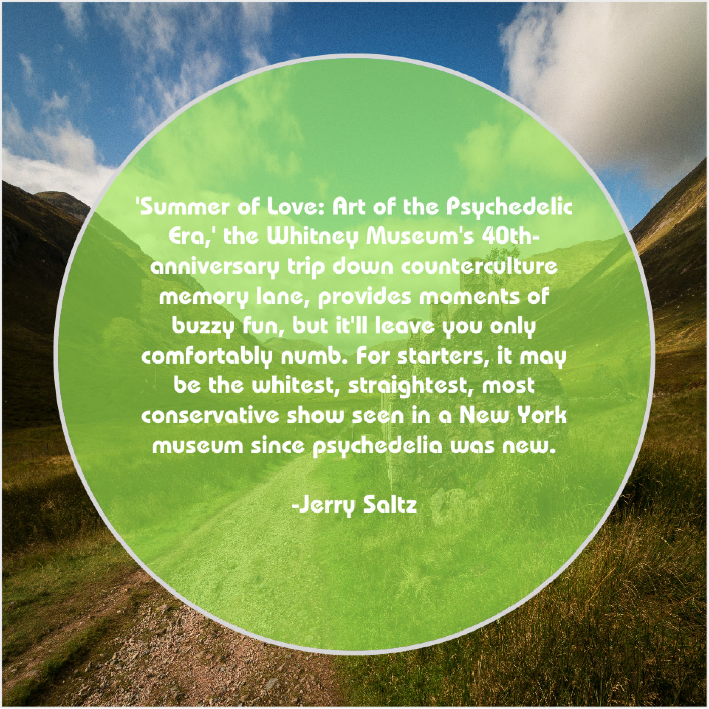 “‘Summer of Love: Art of the Psychedelic Era,’ the Whitney Museum’s 40th-anniversary trip down counterculture memory lane, provides moments of buzzy fun, but it’ll leave you only comfortably numb. For starters, it may be the whitest, straightest, most conservative show seen in a New York museum since psychedelia was new.”