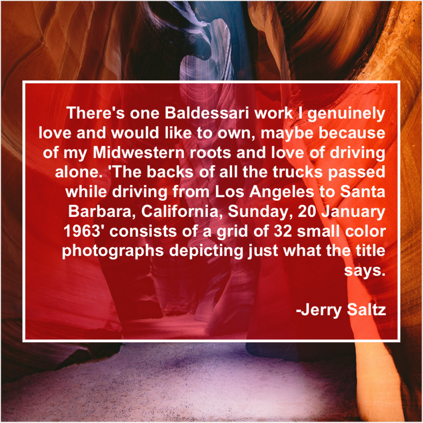 “There’s one Baldessari work I genuinely love and would like to own, maybe because of my Midwestern roots and love of driving alone. ‘The backs of all the trucks passed while driving from Los Angeles to Santa Barbara, California, Sunday, 20 January 1963’ consists of a grid of 32 small color photographs depicting just what the title says.”