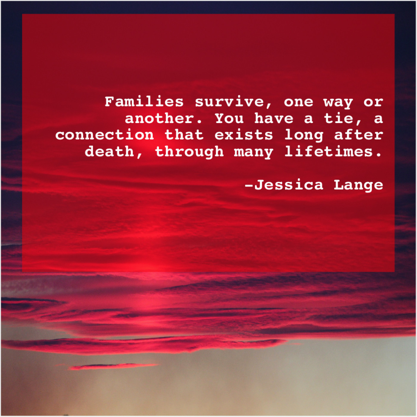 Jessica Lange Jessica Lange – Families survive, one way or… October 14, 2019 admin “Families survive, one way or another. You have a tie, a connection that exists long after death, through many lifetimes.”-Jessica Lange